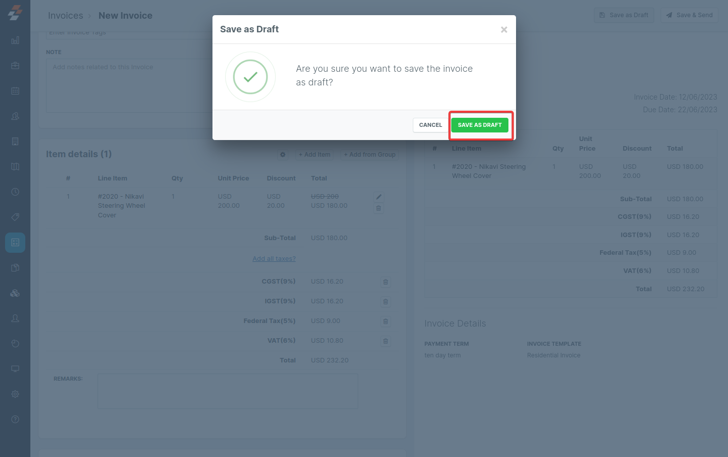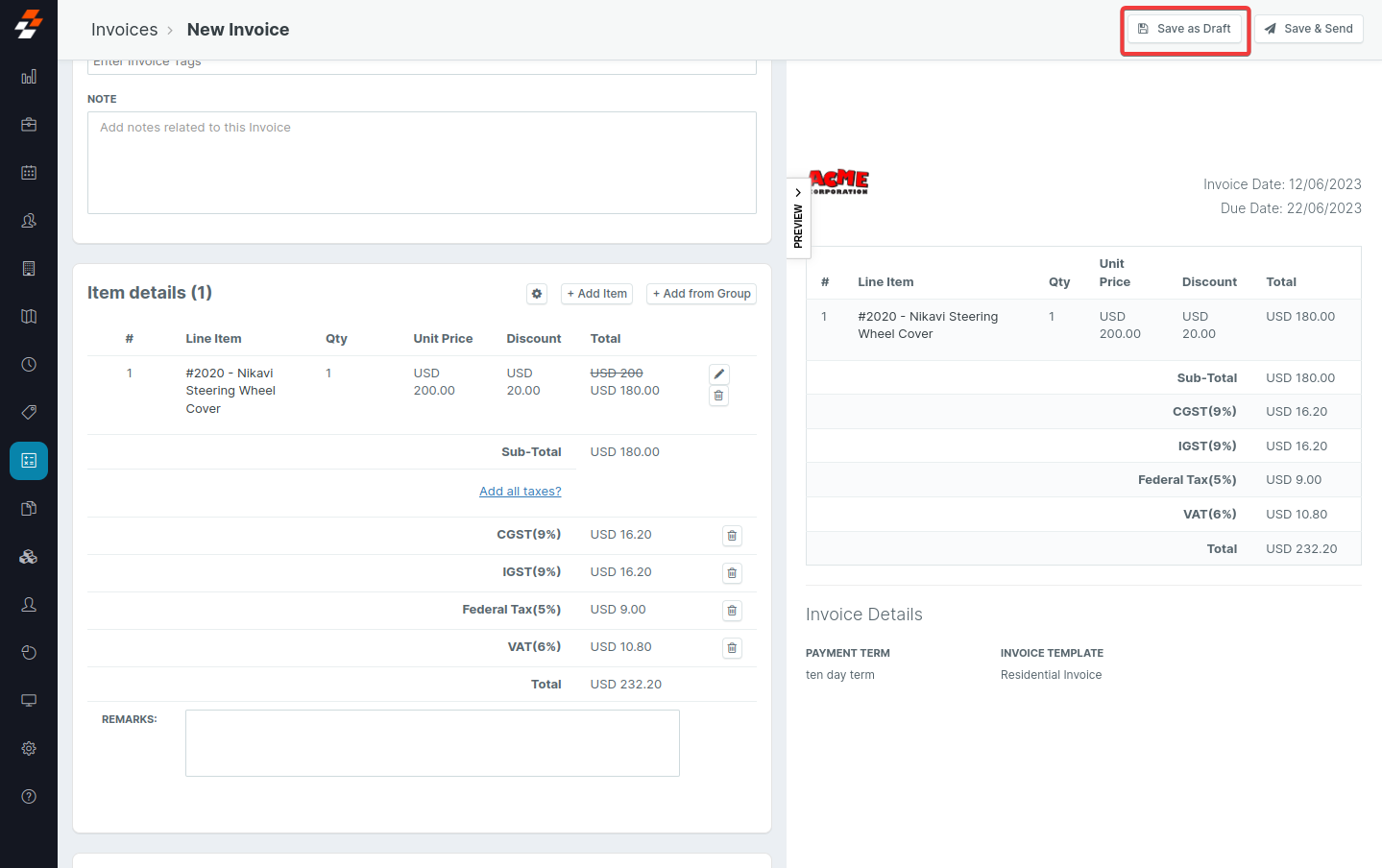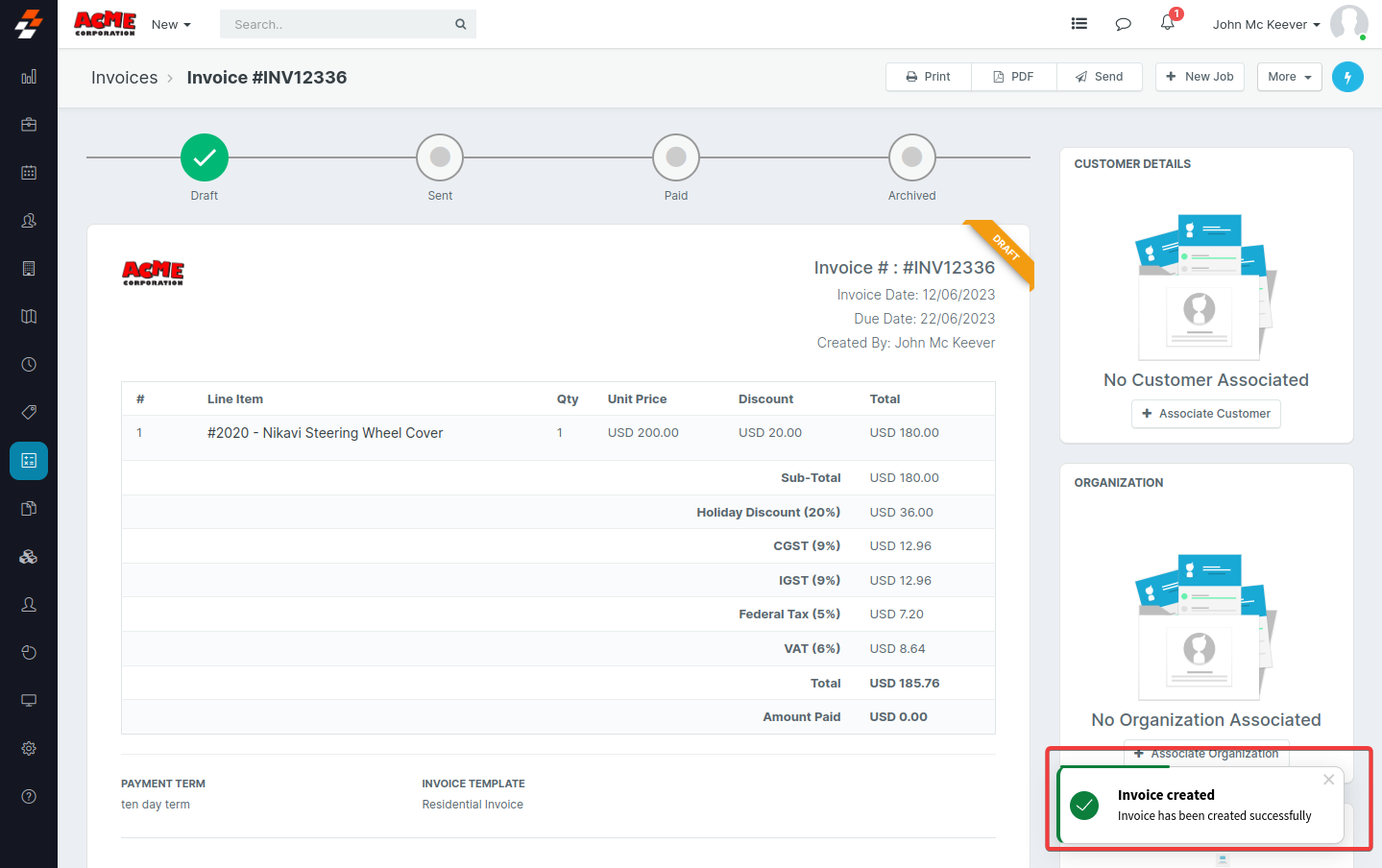 - You will be redirected to the New Invoice Form where all pertinent information is auto-populated from the quotation.