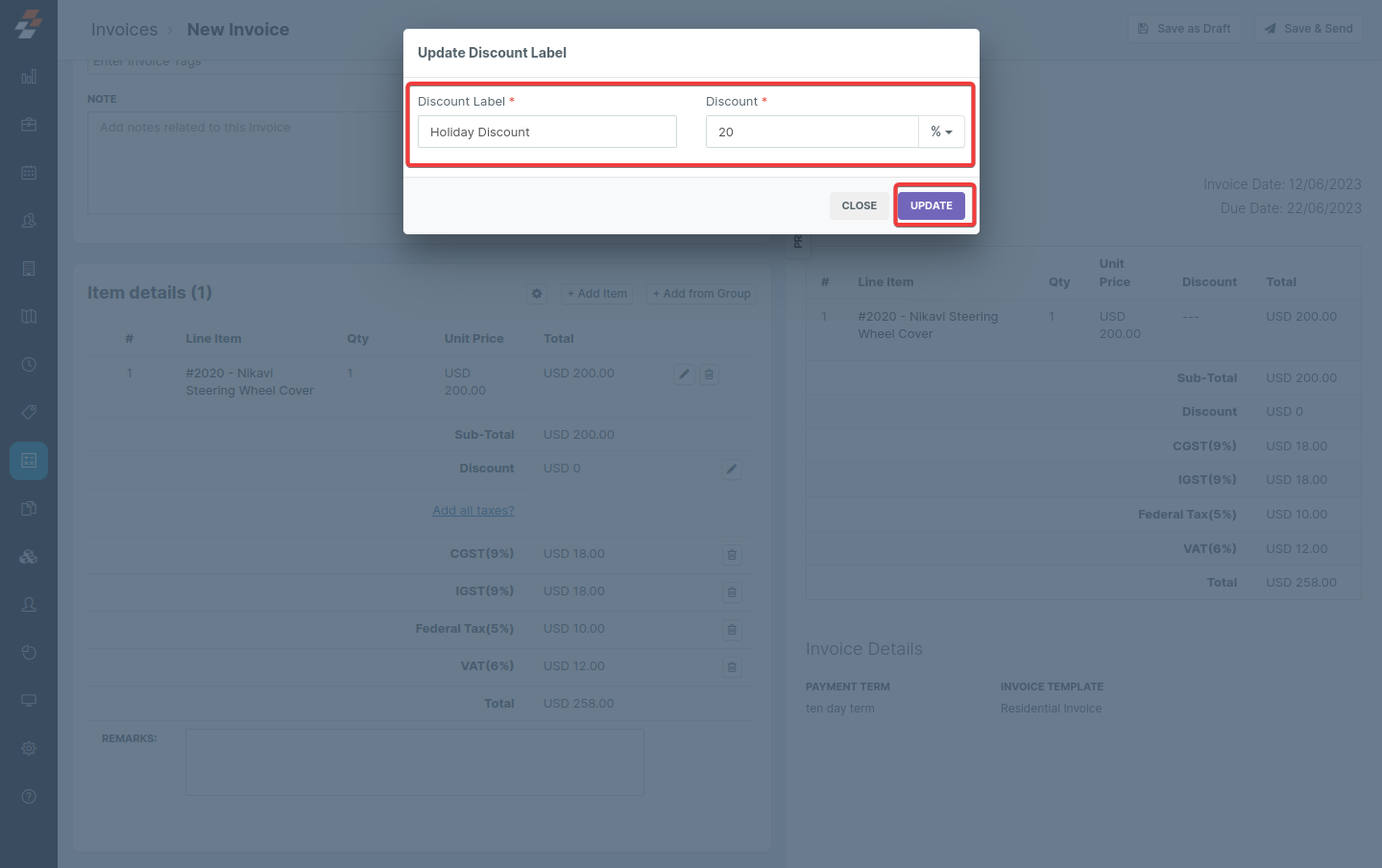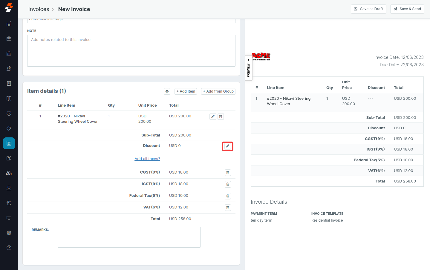 Discount (Mandatory Field)– The Discount can be either based on the % or per the currency defined in the company configuration (For example, USD).