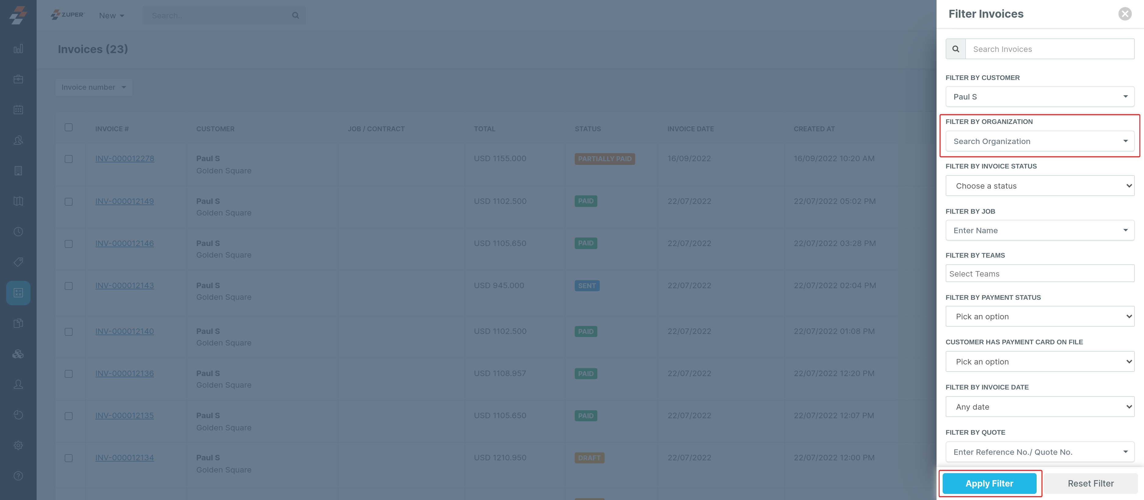 Navigation: Accounting --> Invoices --> Filters --> Select Filter --> Apply FilterThe user can easily view the related organizations using the