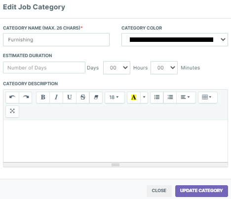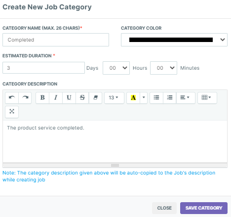 Estimated Duration: Specify the estimated time required to complete a job within the category (adjust days, hours, and minutes drop-downs)