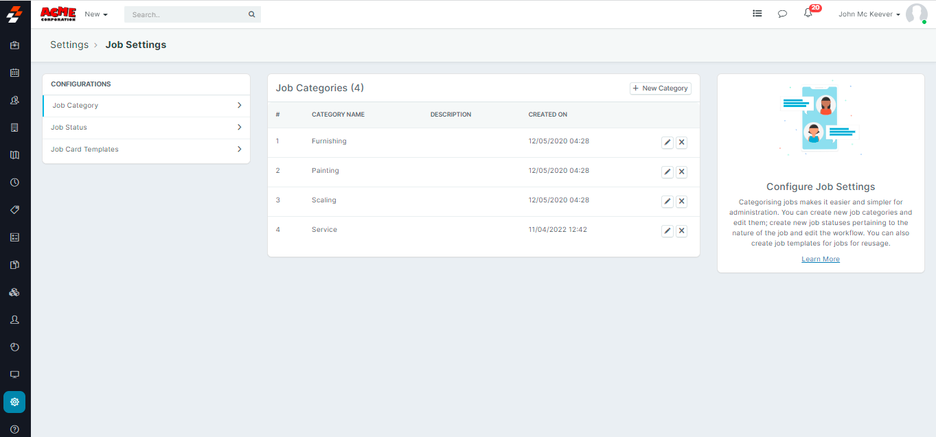 You will be redirected to the "Job Settings" page, select the "Job Category" button that is present beneath "Configurations". Now click on the "New Category" button to create a new job category. This will prompt a Create New Job Category dialog.