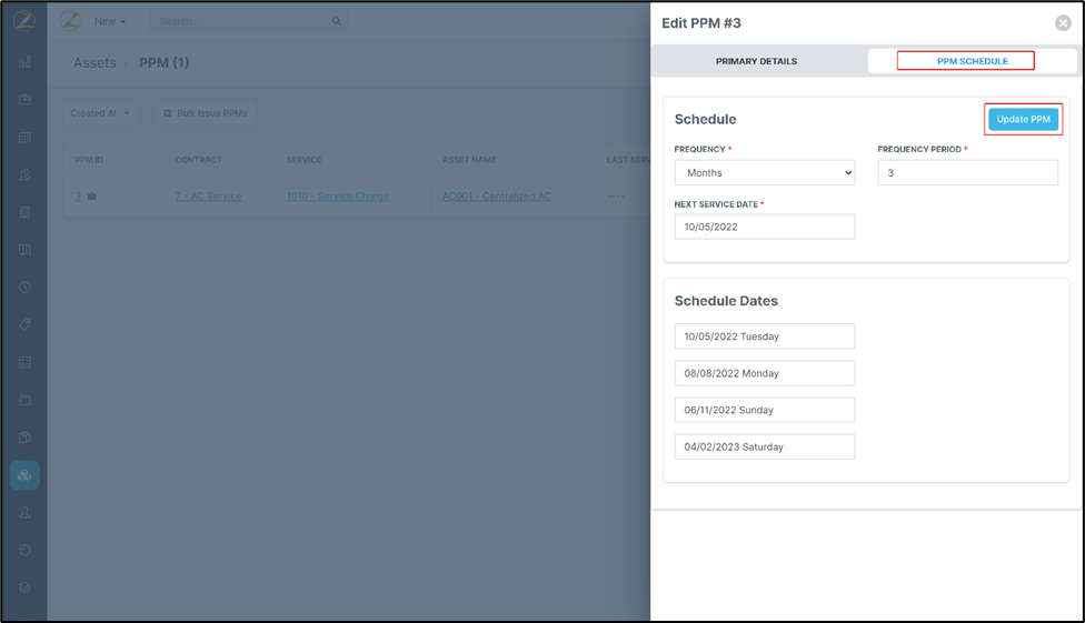 Schedule Dates | The dates for the upcoming schedule. Click on the “Update PPM” button to edit the existing rules. |