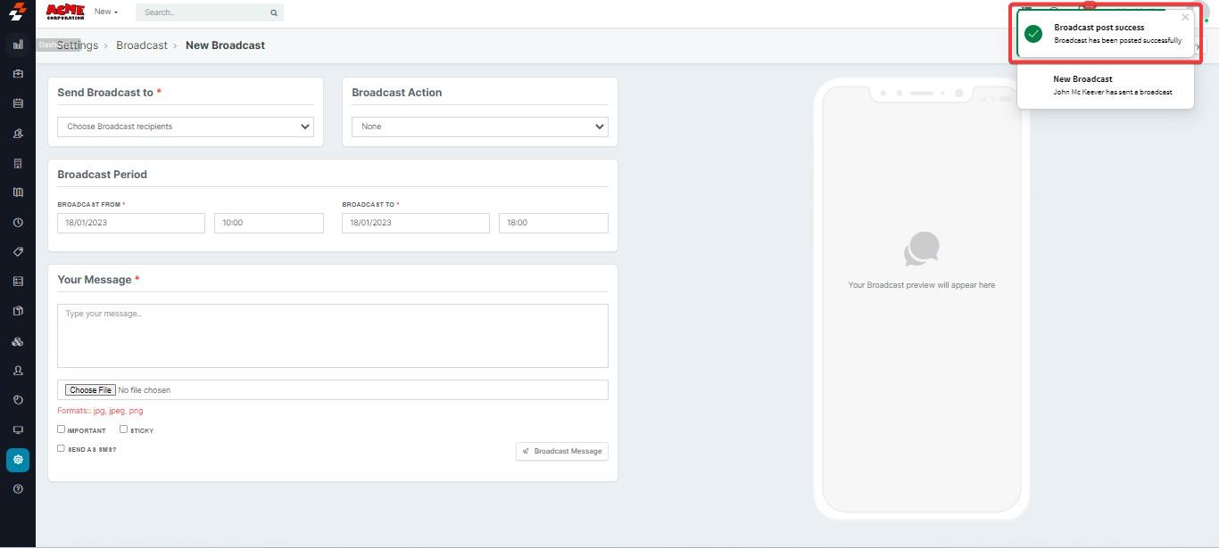 2. Select "+New Broadcast" button to send a notification.