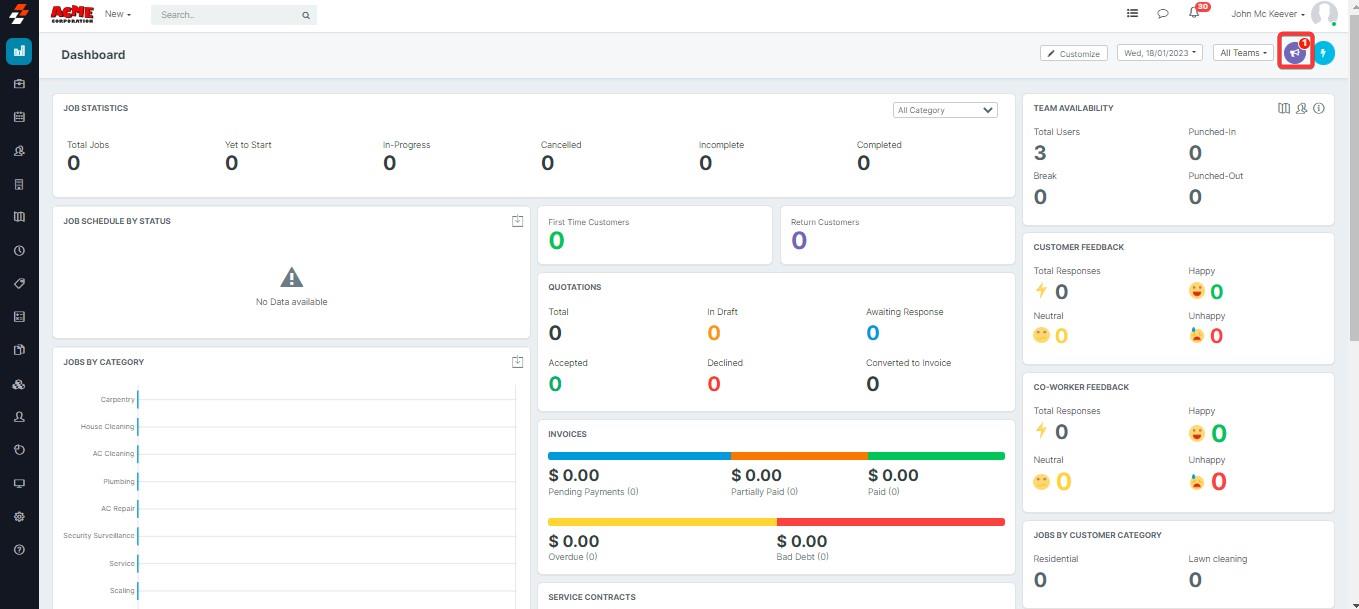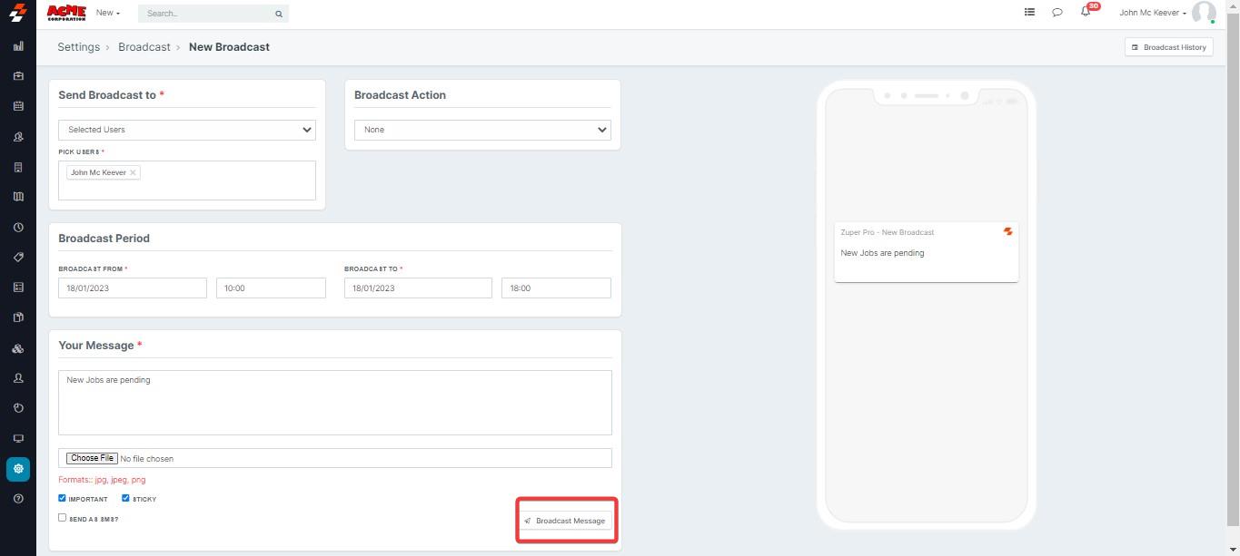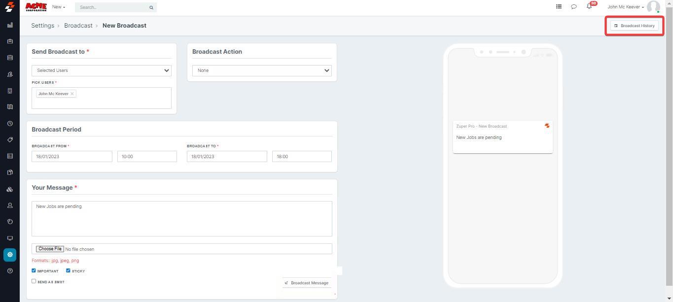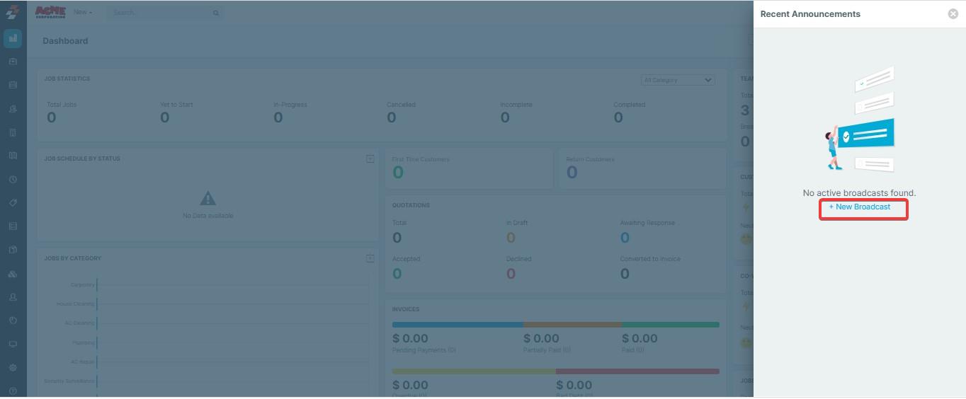 1. Login to your Zuper account and click "Broadcast" icon from the top right section.