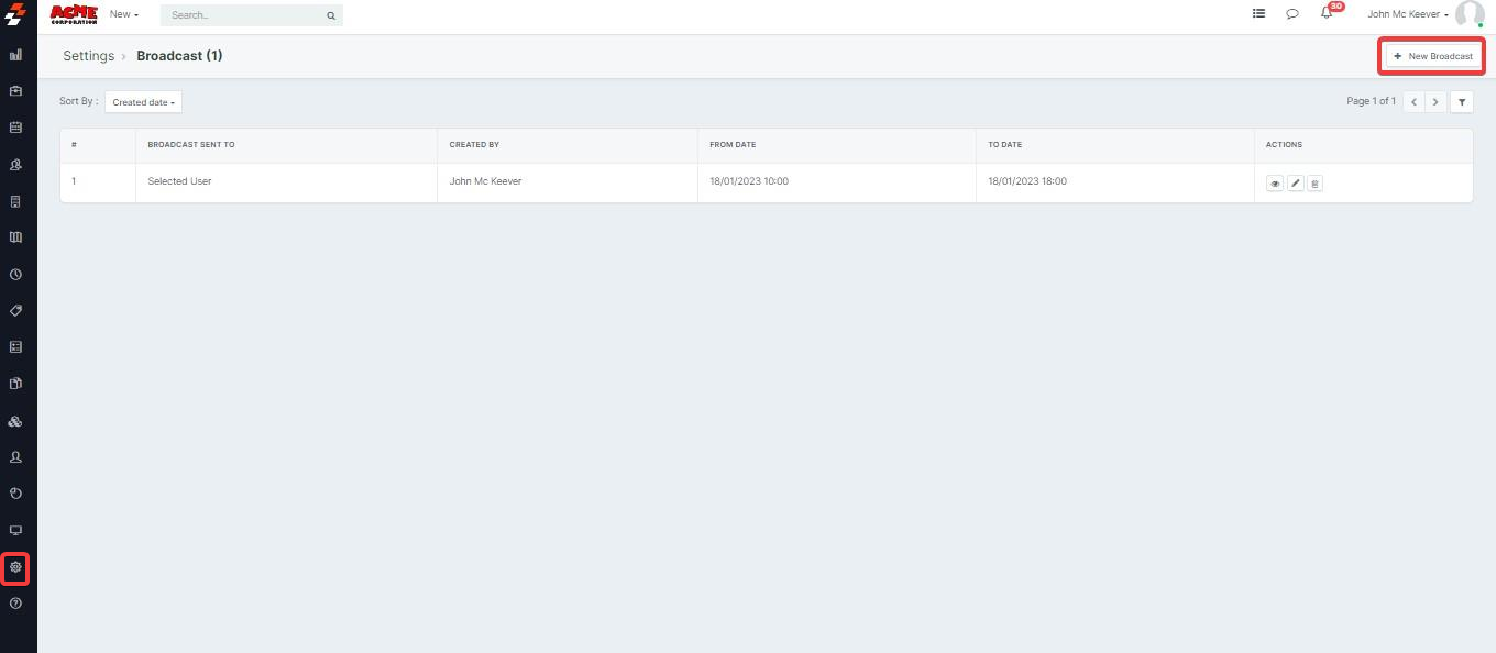 1. Select the "Settings" icon from the left panel and from the broadcast settings allows you to view, edit, or delete the existing broadcast messages.