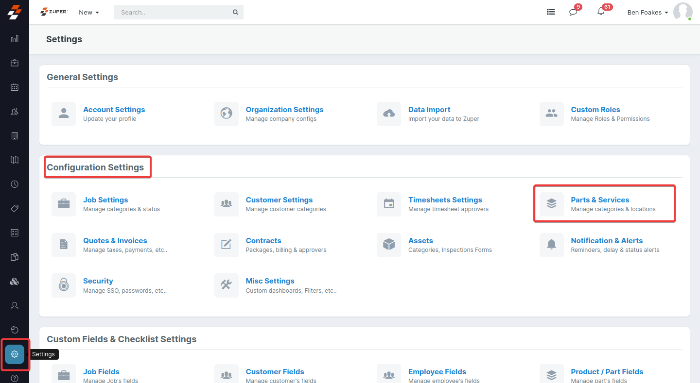 Select the “Settings” module from the left panel. From the “Configuration Settings,” select the “Parts and Services”