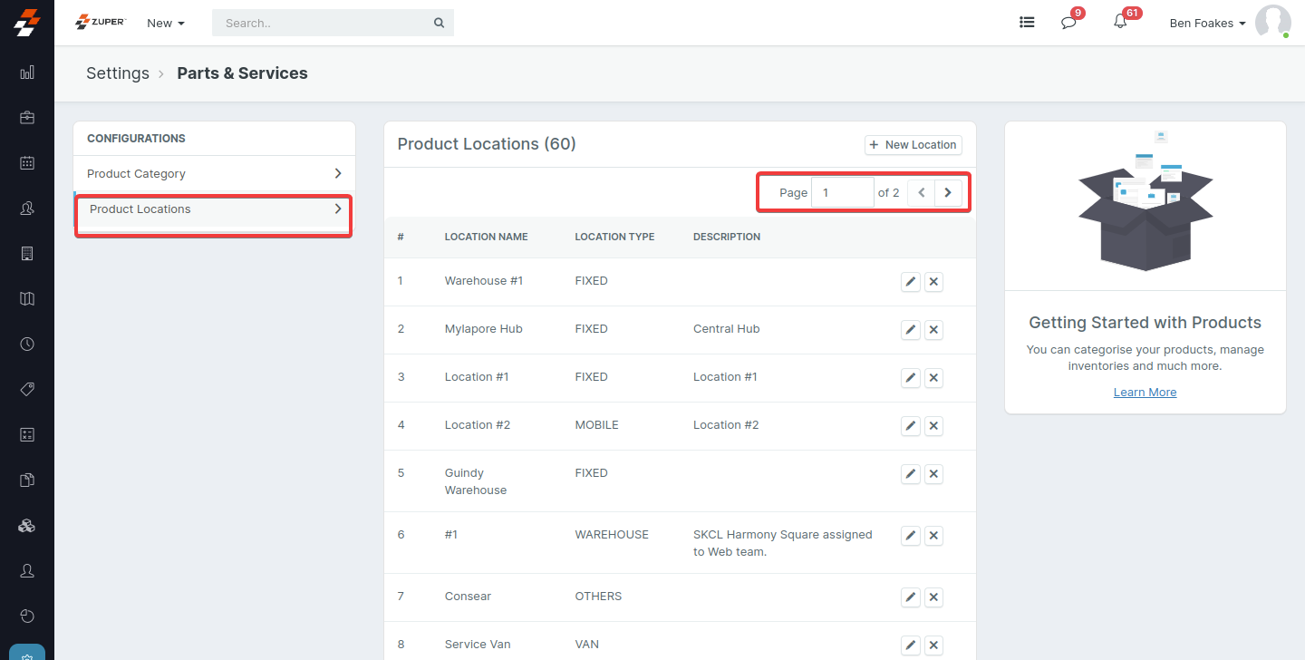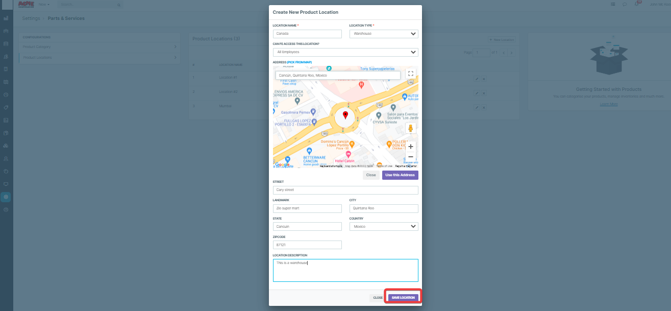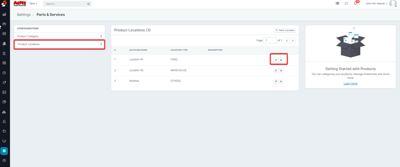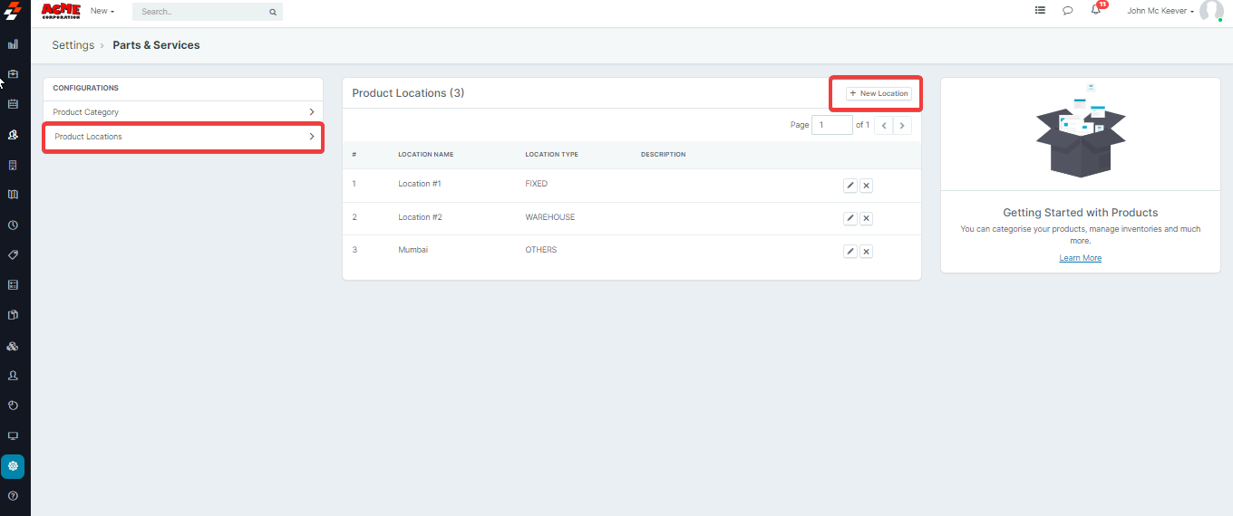 4. On the "Parts & Services" page, select "Product Location" and click on the "New Location" button.