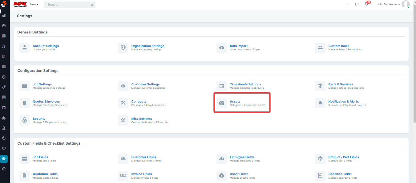 The part, services, and Products in Zuper are organized using the asset categories. Please follow the below instructions to create an asset category,