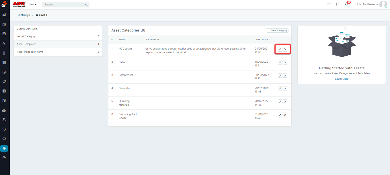 Similarly, click on the "Edit"(pencil icon) next to the category to be edited. This will bring up the "Update Asset Category" window, make the required changes, and click on "Update Category" or use the "Delete" category to remove the category.