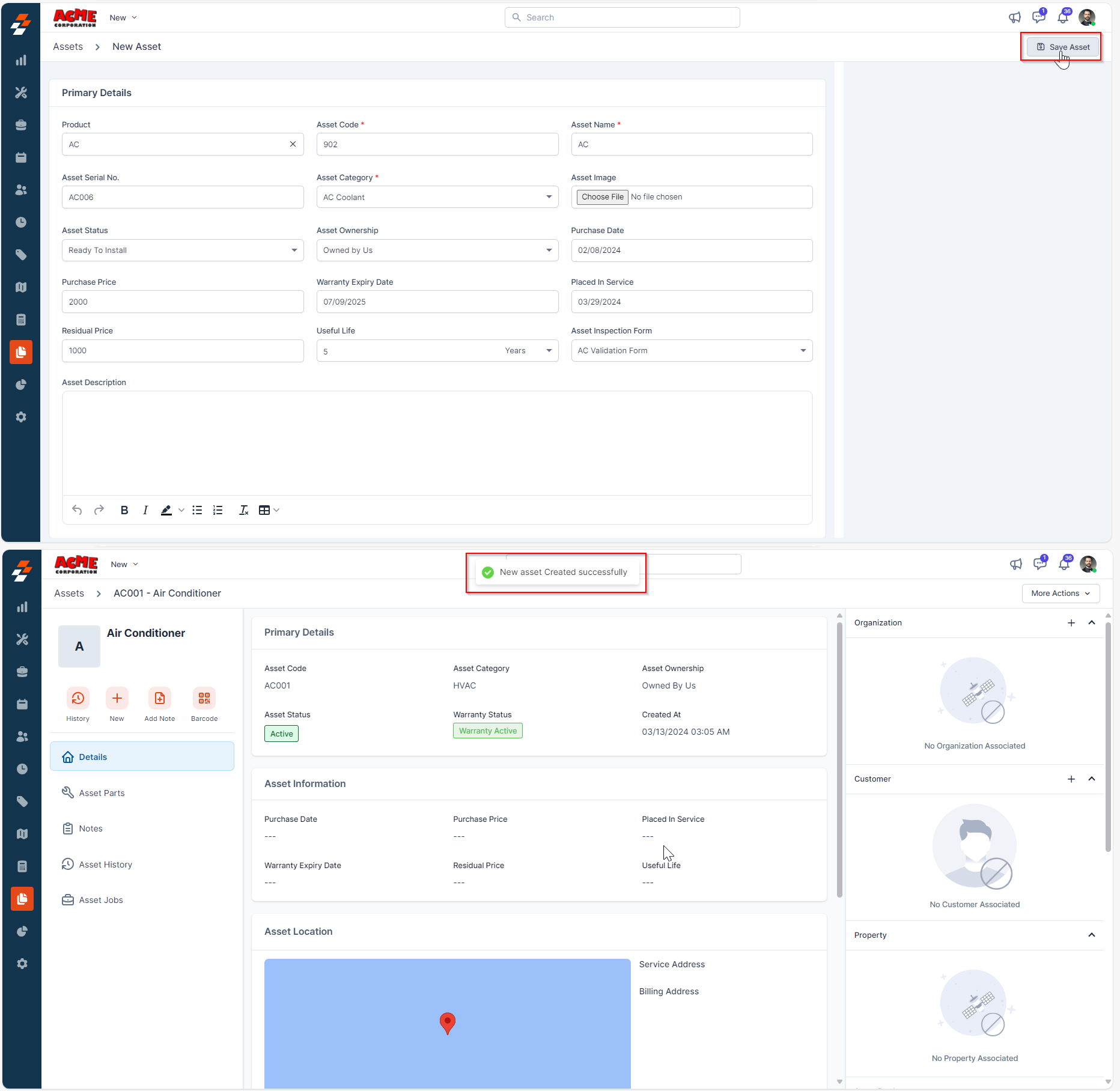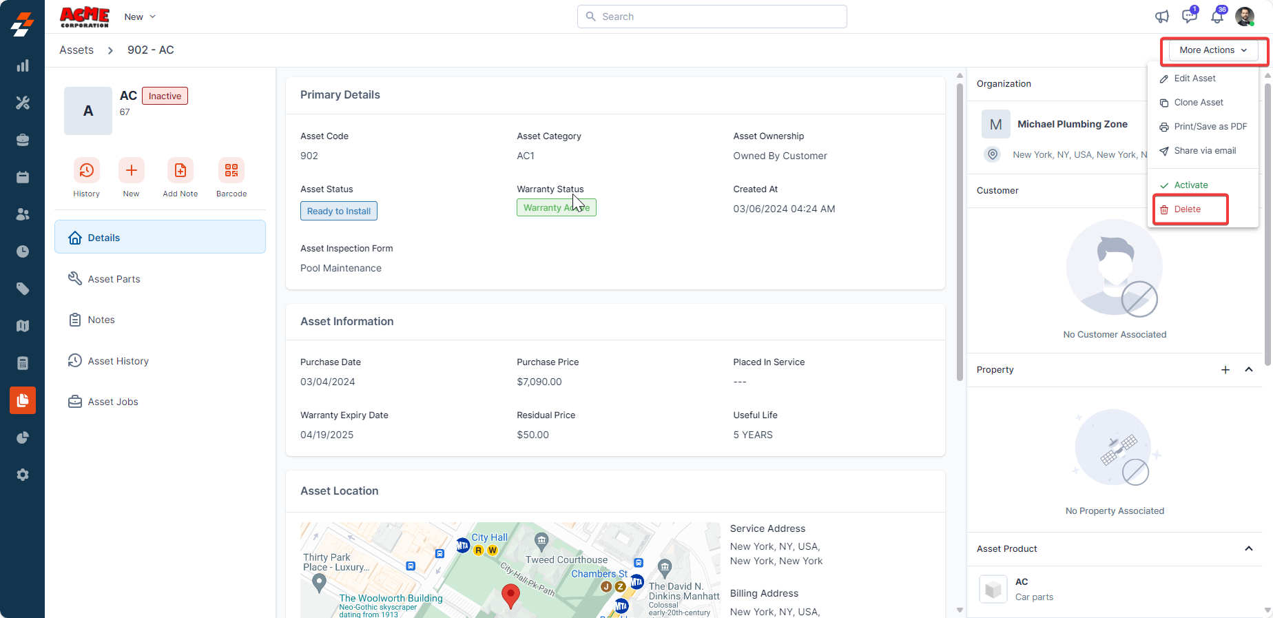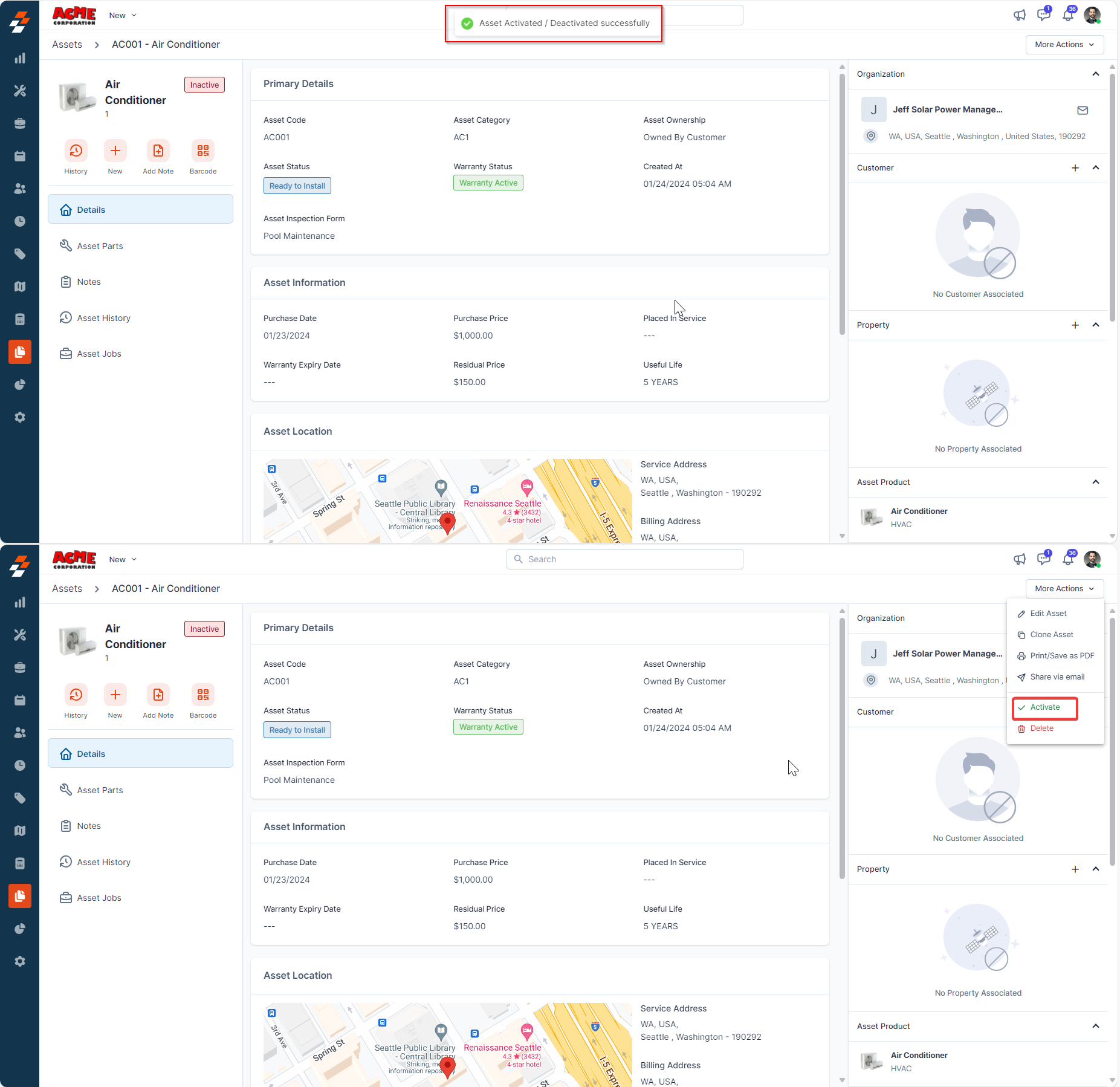 3. The asset will be deactivated successfully. To reactivate it, click "Activate Asset" button. Once activated you can then view the asset and add it to the jobs or contracts, as needed.