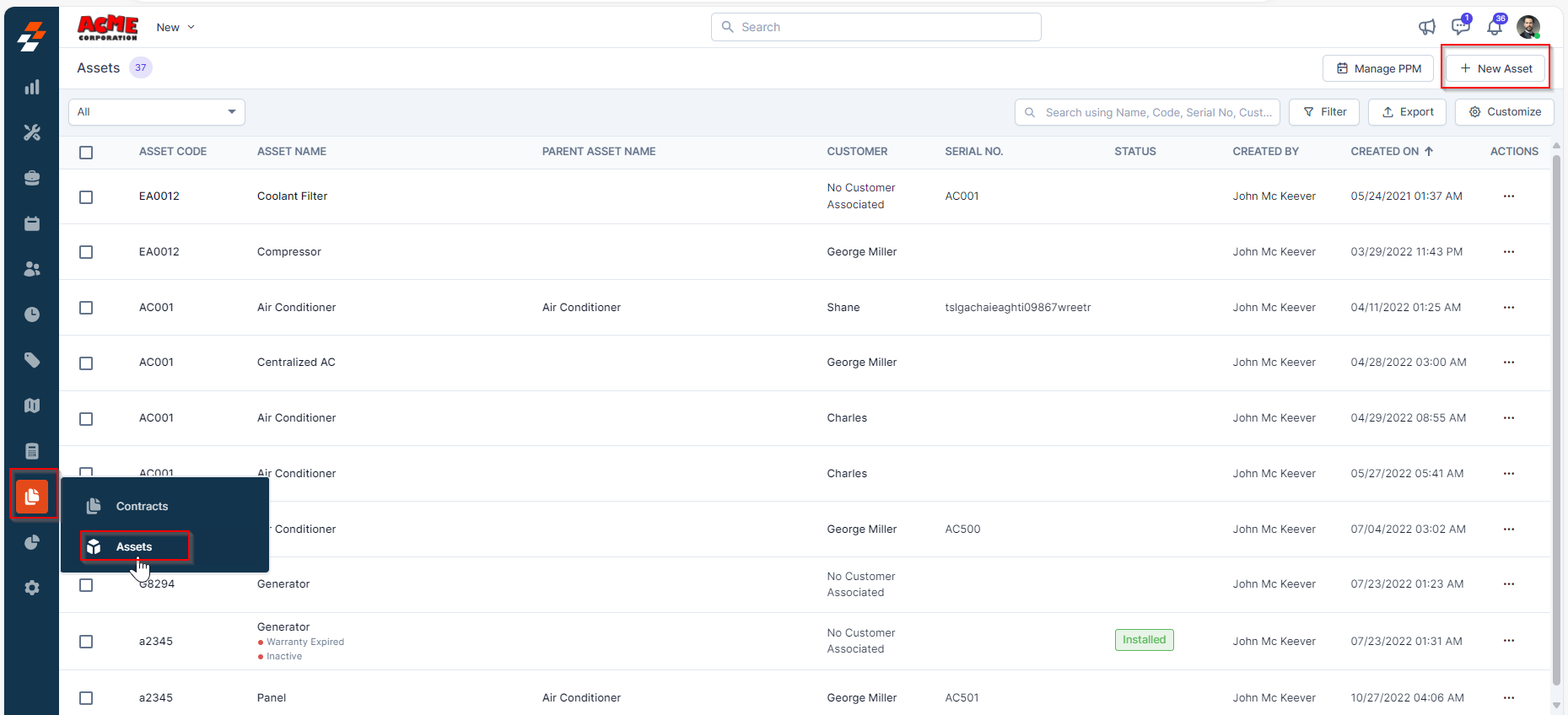1. Click the Assets icon from the left navigation menu and choose the “Assets” module. You will view the list of assets (both active and inactive) on the asset listing page.