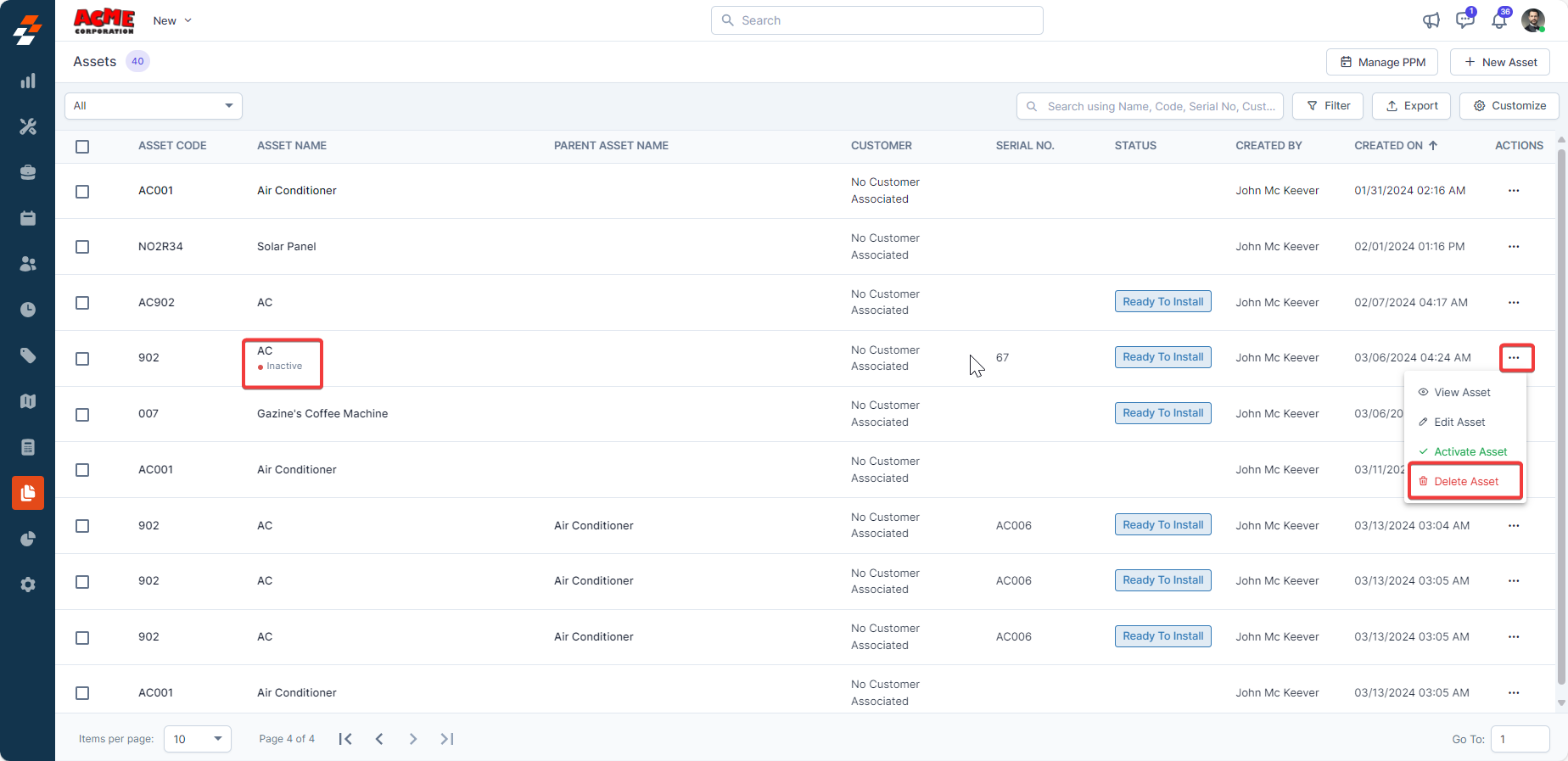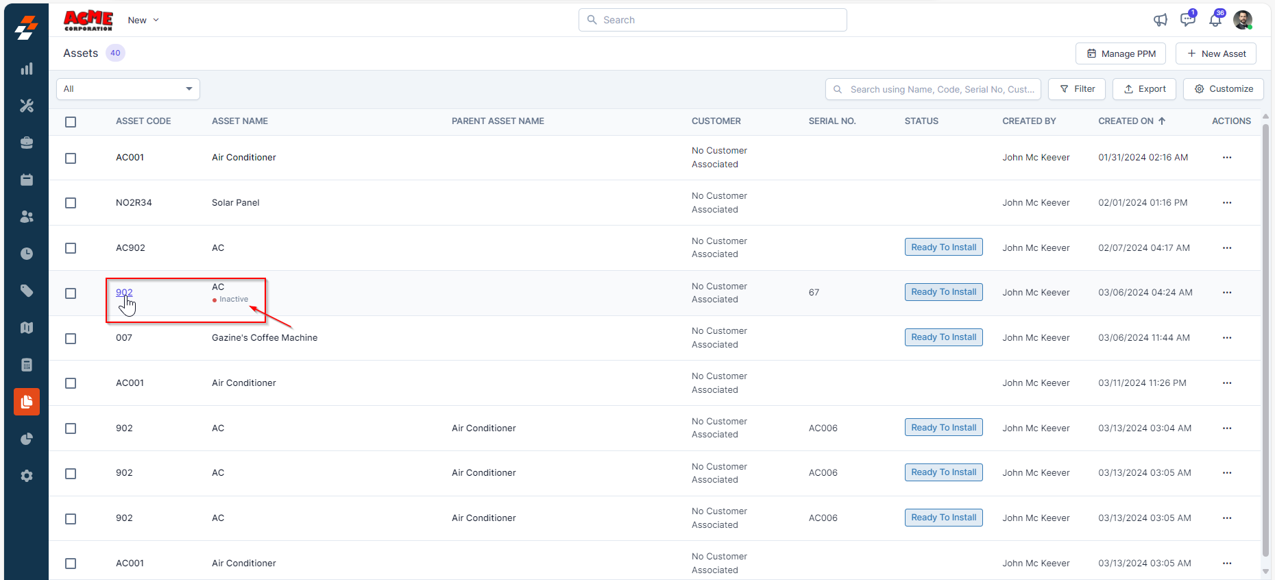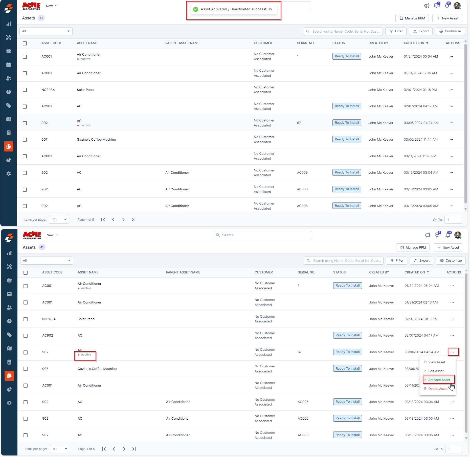 To deactivate/activate an asset from the asset listing page, follow these steps: