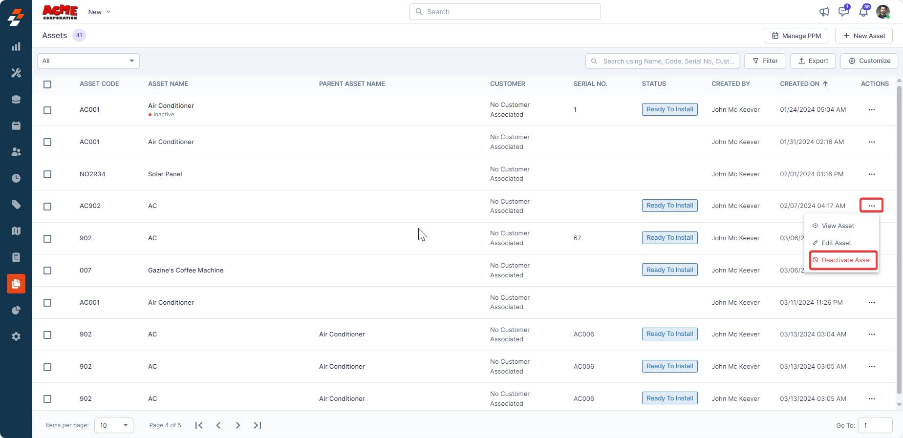 2. To deactivate an asset, select "Deactivate Asset" from the "ellipsis" icon under the action column.