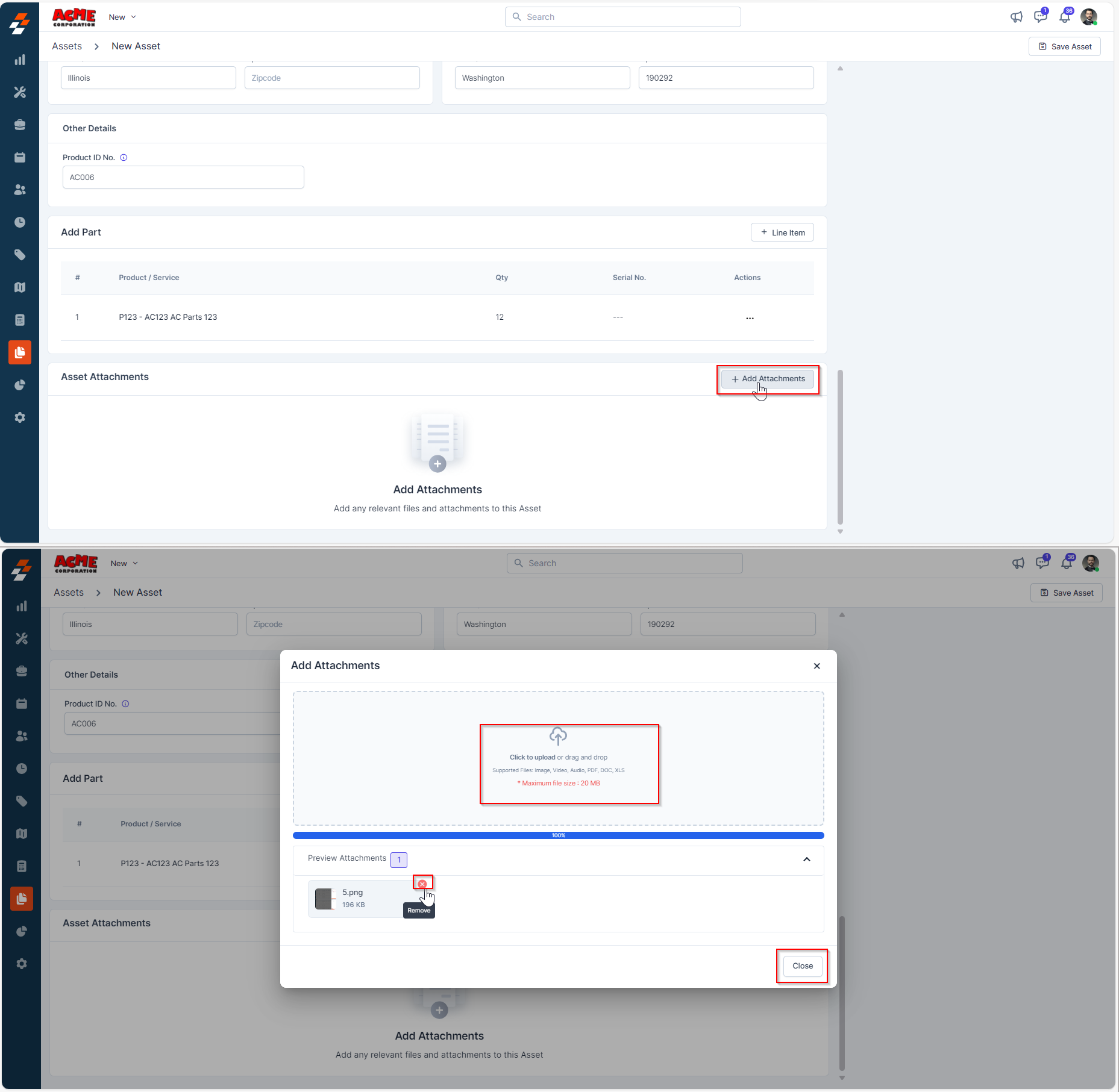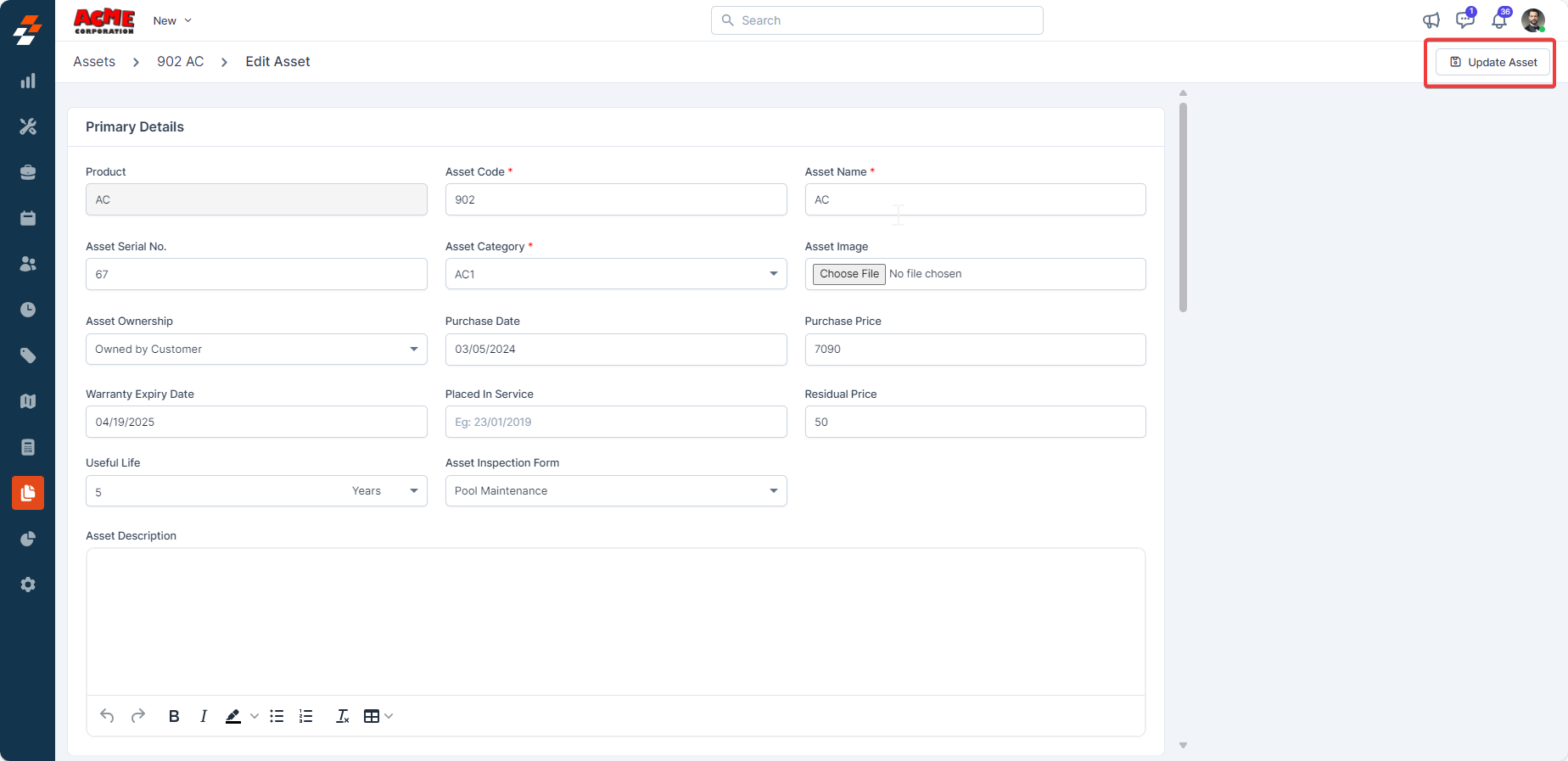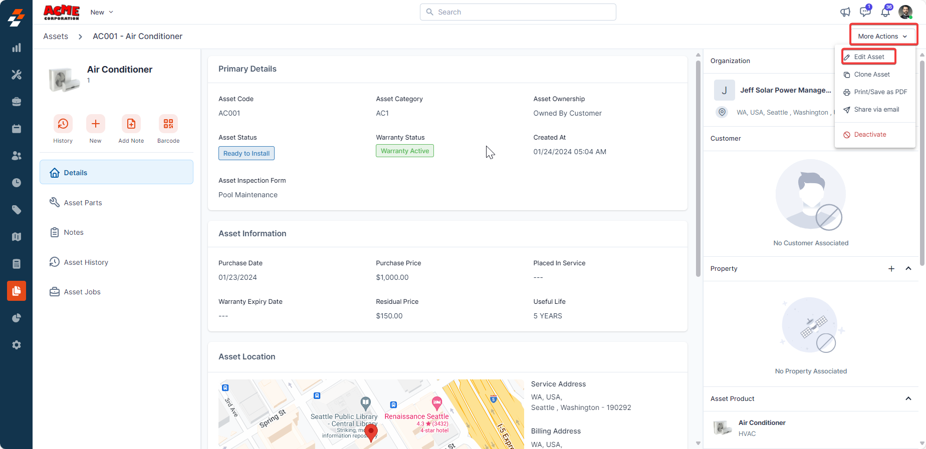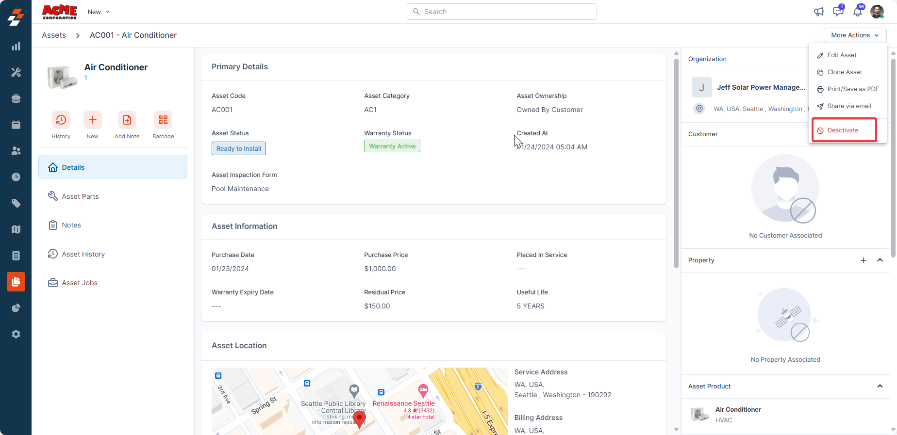 You can view the asset details page directly after saving an asset or from the asset listing page. To deactivate/activate an asset from the asset details page, follow these steps: