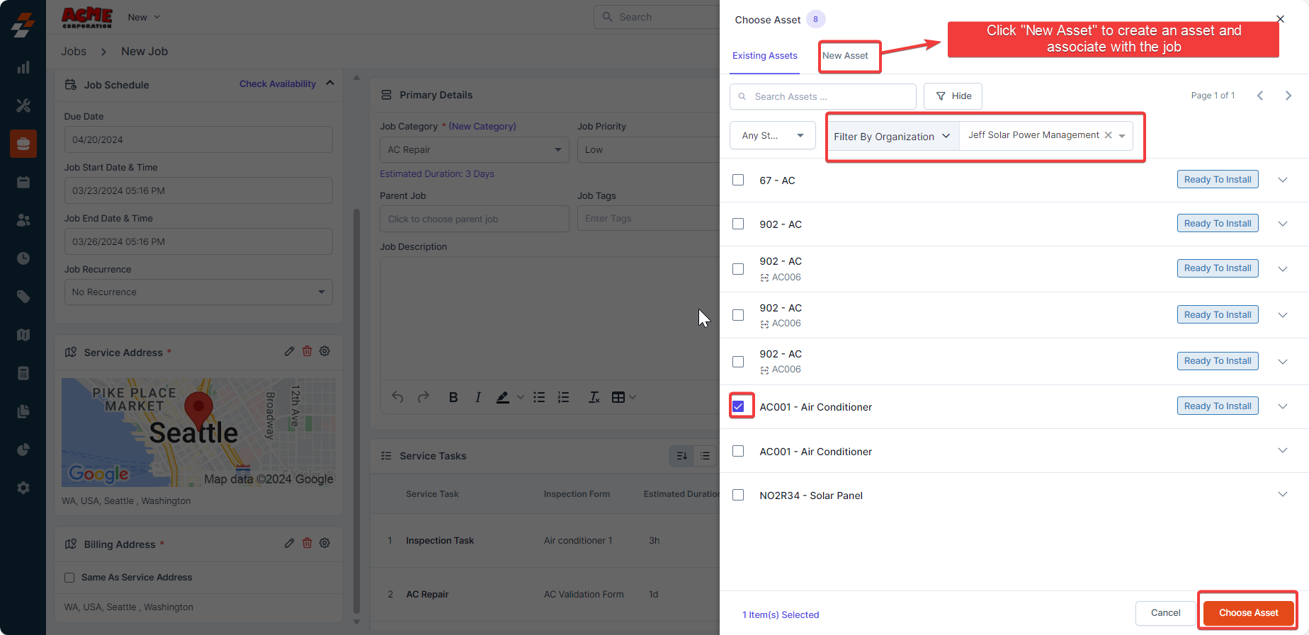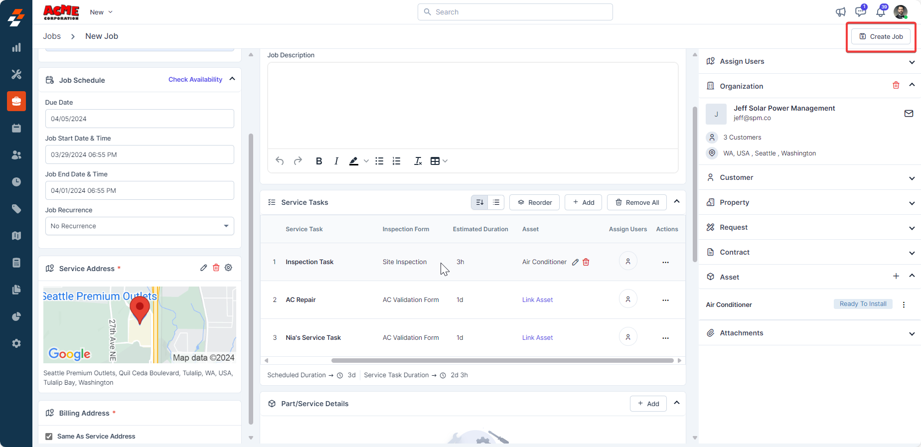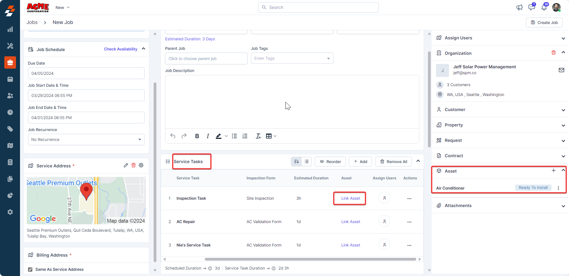 3. Add the job details such as job title, job category, due date, service address, organization/customer details, and so on records. To associate an asset with inspection form in the job, click "+ Add Asset" under Assets in the right pane.