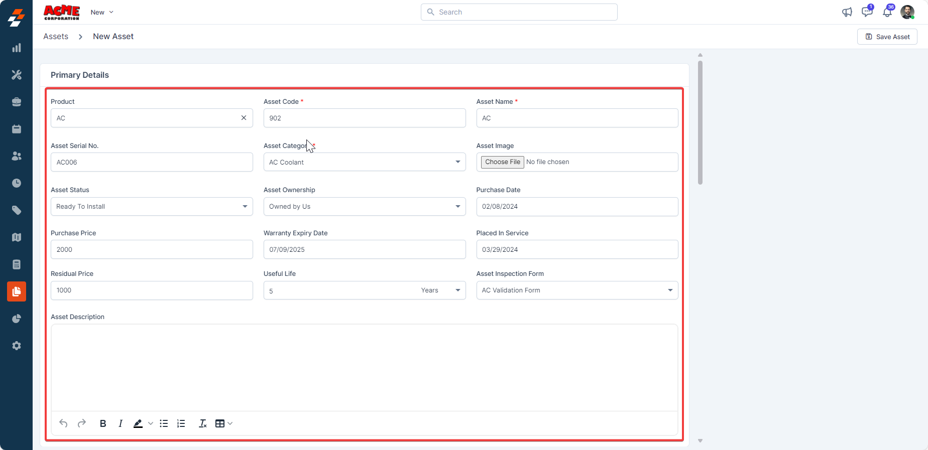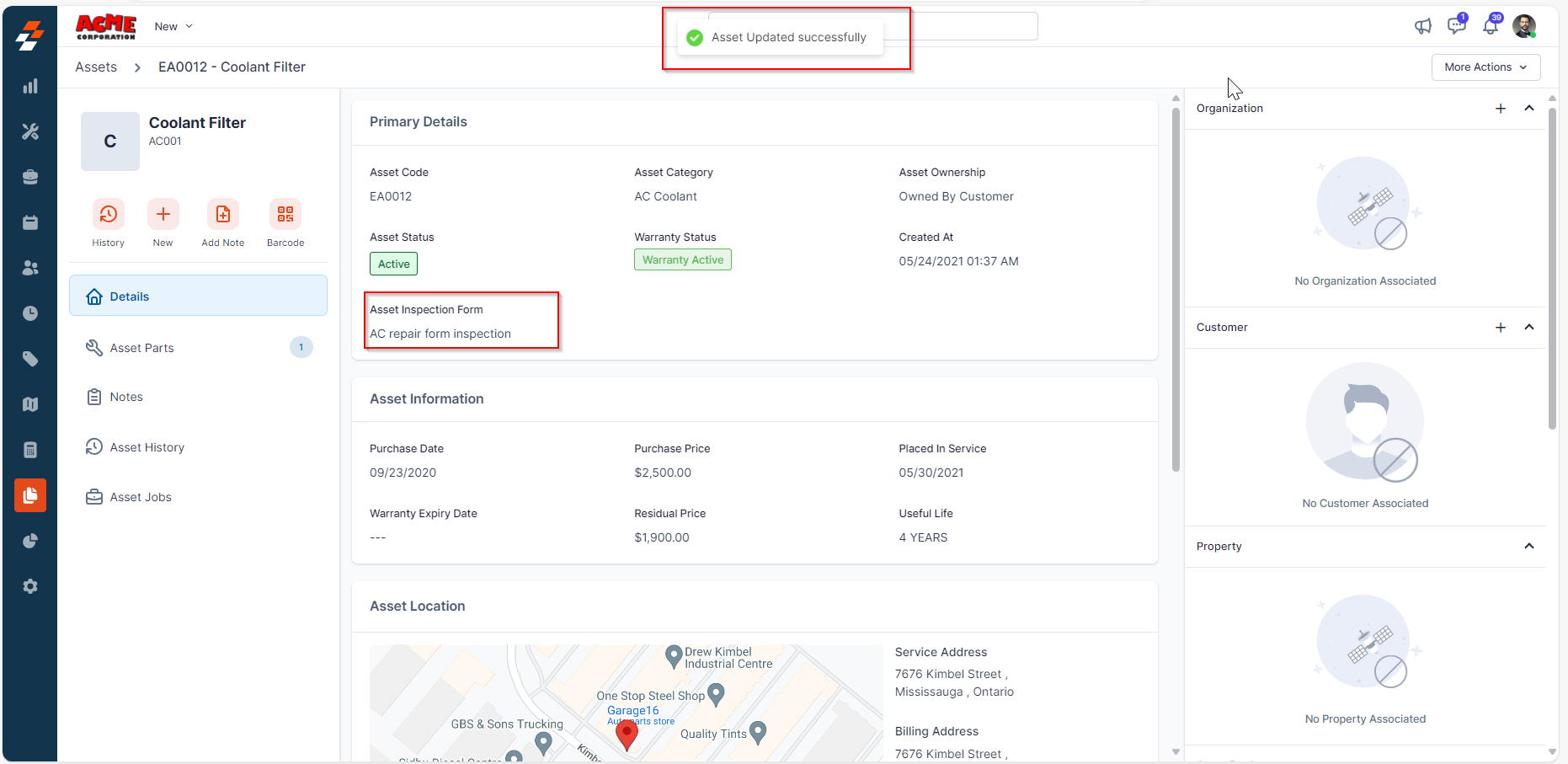 3. Add other information such as customer information, service address, parts, attachments and so on. Once done, click the "Save Asset" button to create an asset with the associated inspection form.