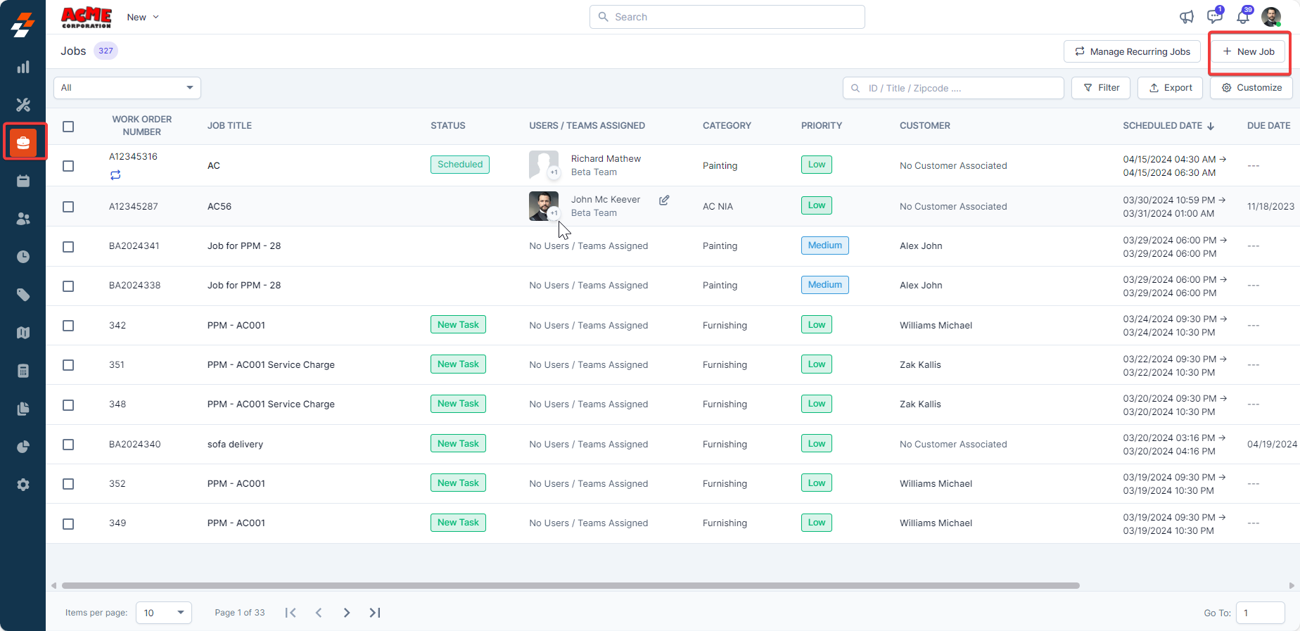1. Select the “Jobs” module from the left navigation menu. You can view the list of jobs with job title, status, category and so on data in the listing page.