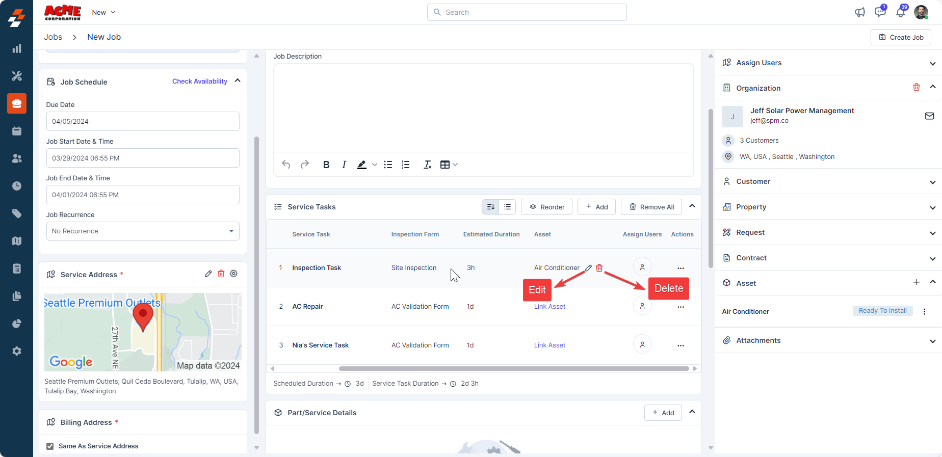 5. Once the Asset has been linked to the service tasks, you can either "edit" or "delete," as needed.