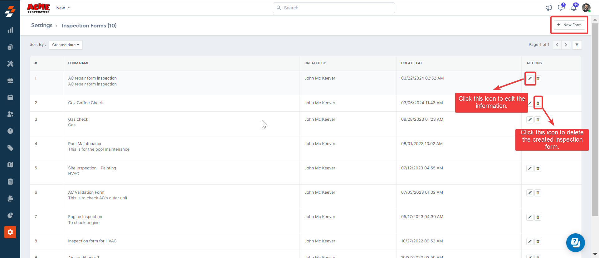 2. You can view all the inspection form created in the listing page. You can also edit or delete the existing inspection form from here. To create a new inspection form, click “+ New Form" at the top right corner of the page.