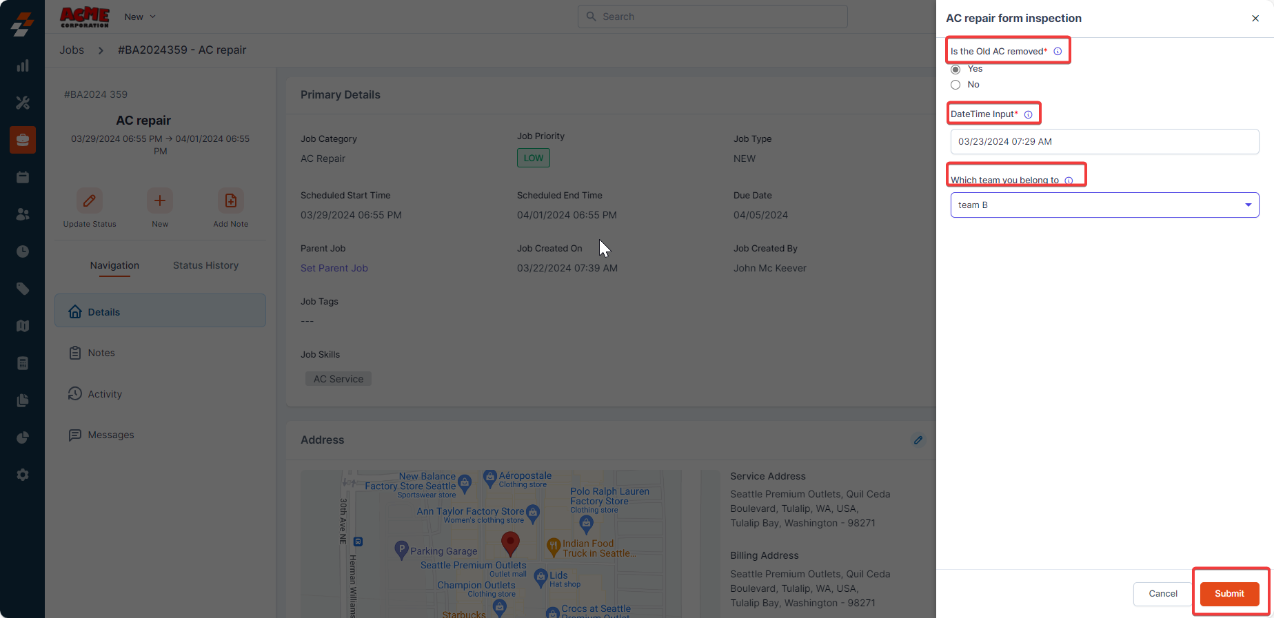 After creating an inspection form and associating it with an asset, you can then link the asset with an inspection form in Jobs. As a result, when a job is assigned to a field technician, they can use the associated asset inspection form and complete the inspection fields before marking the job status as complete.