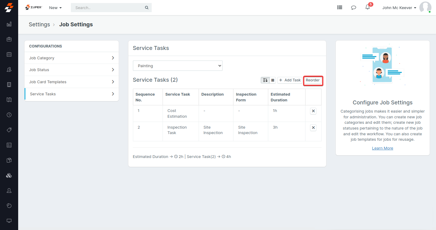 Under the “Tasks” section, select the “Settings” icon to reorder the tasks.
