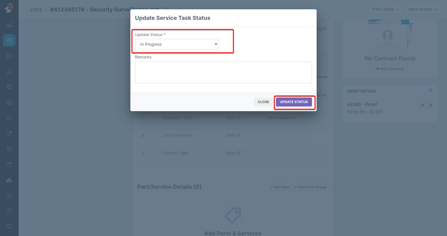 5. An “Update Service Task Status” pop-up will appear, Select the status from the drop-down list and click the “Update Status” button. Enter additional comments if required.