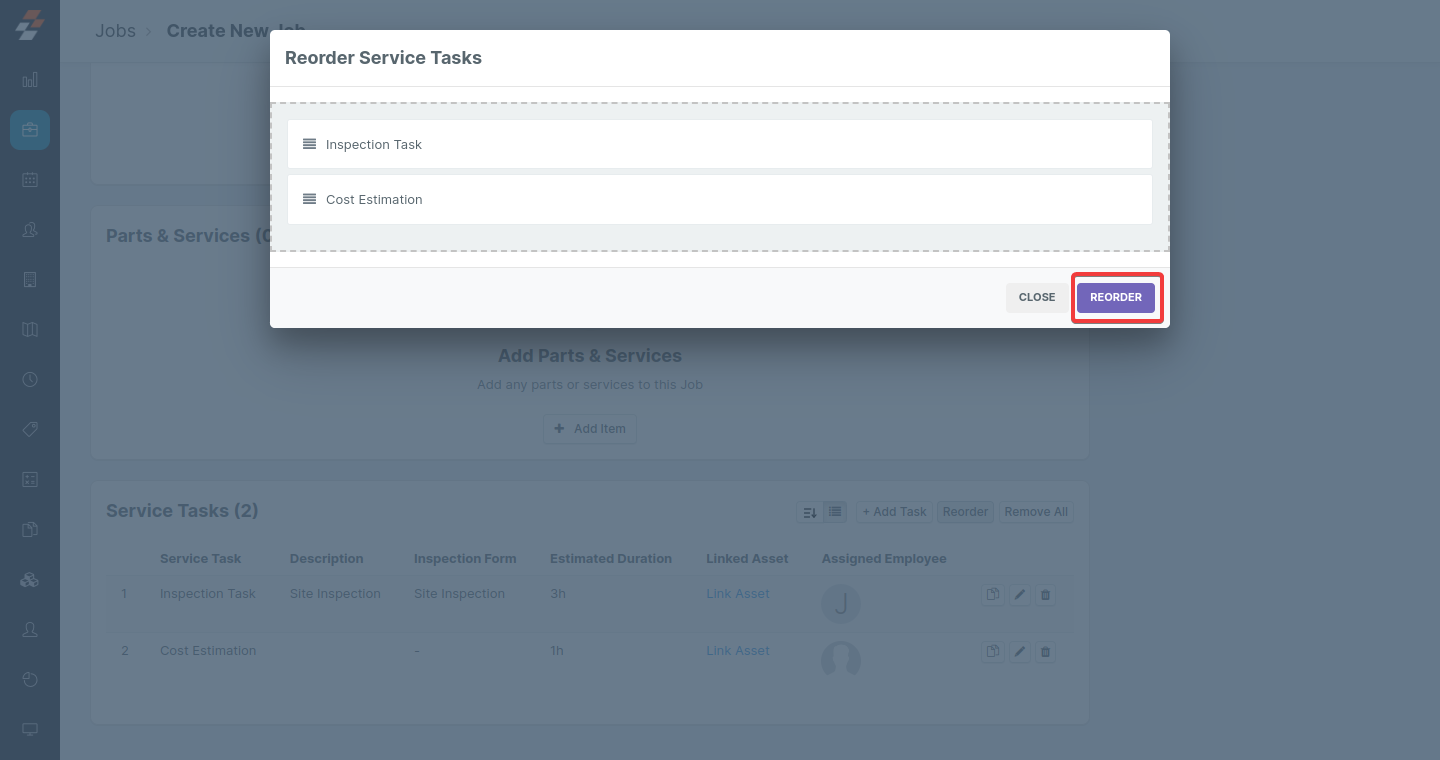 19. A “Reorder Service Task” pop-up will appear. Drag up and down to reorder the tasks and select the “Reorder” button.
