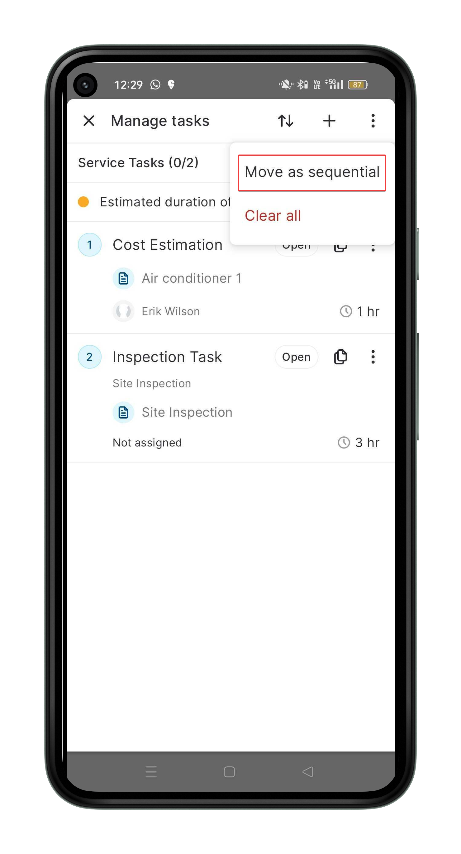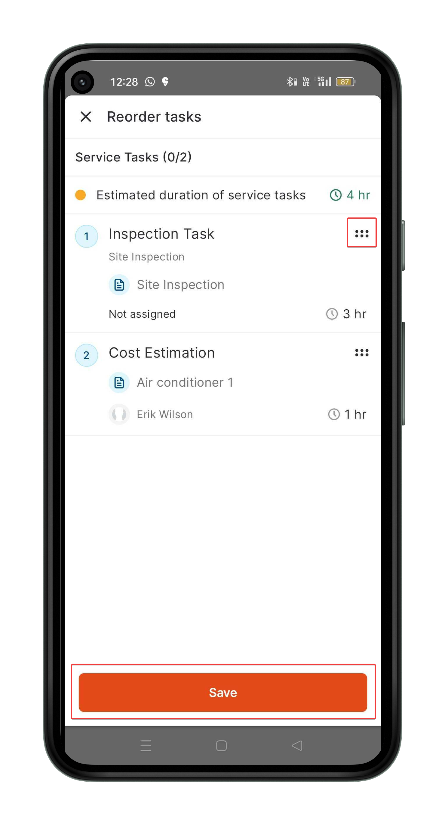 7. Select the “Reorder” option to change the sequence of the tasks.