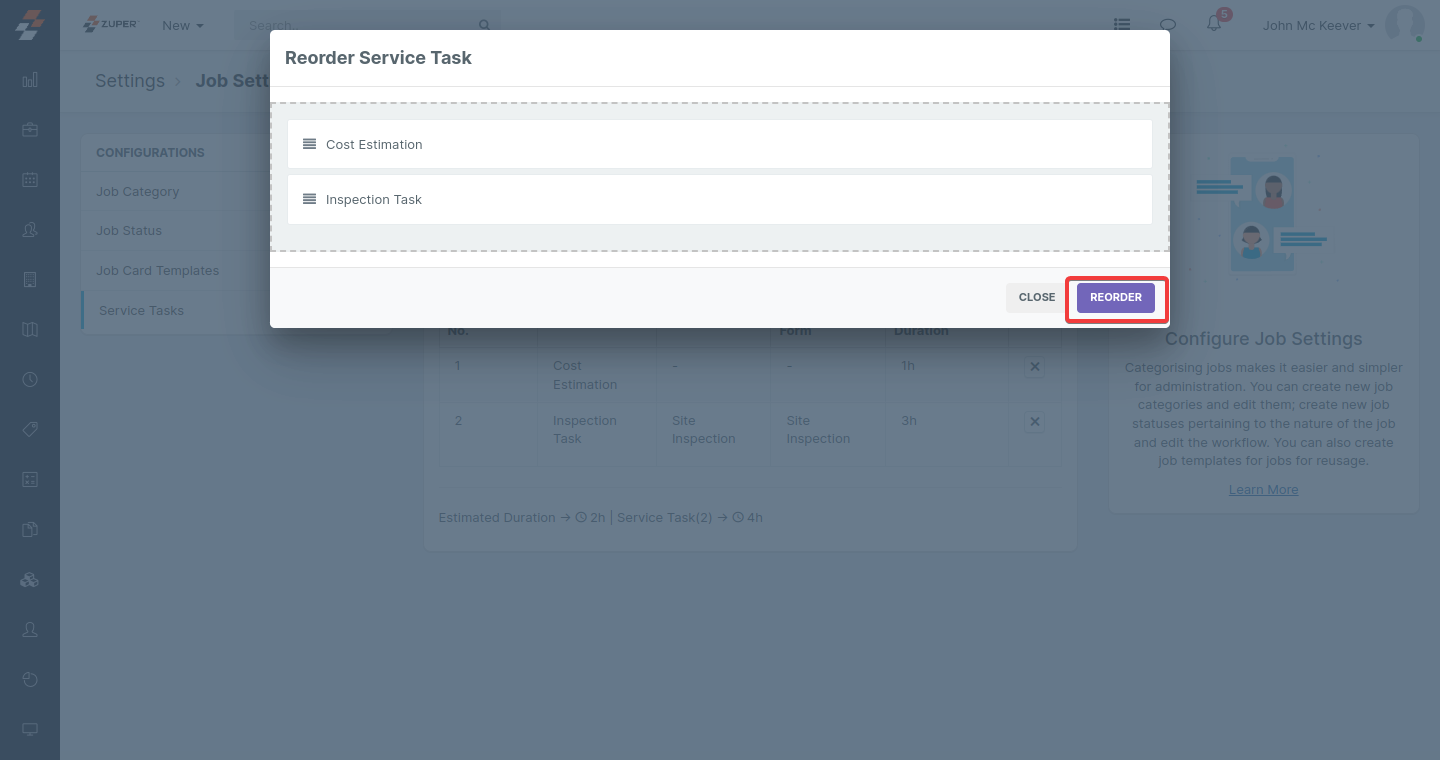 8. A “Reorder Service Task” pop-up will appear, drag and drop; up and down to reorder the tasks and select the “Reorder” button.