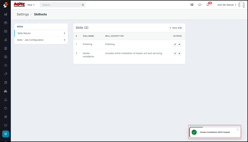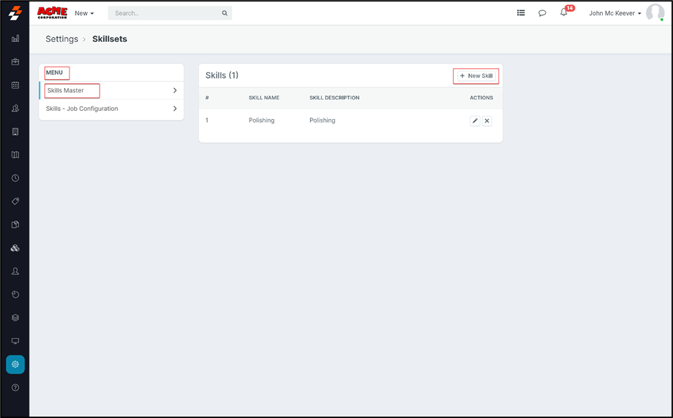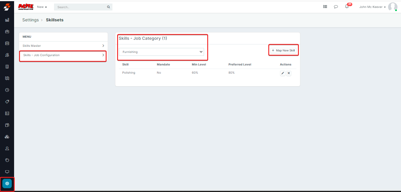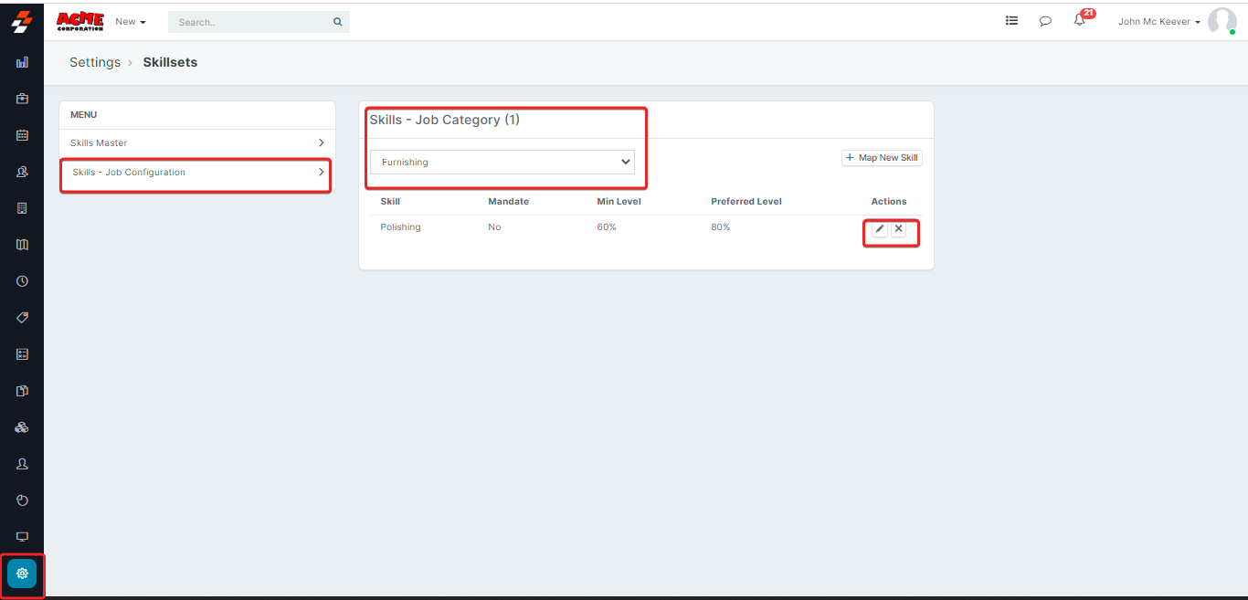 1. Select the "Settings" icon from the left panel, and choose the Job Category - drop-down box. Now you canchoose to edit or delete the “Skills Job Configuration,” All you must do is tap on the “Actions” section.