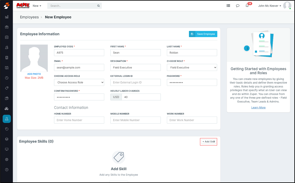 Add New Employee’s Skills: