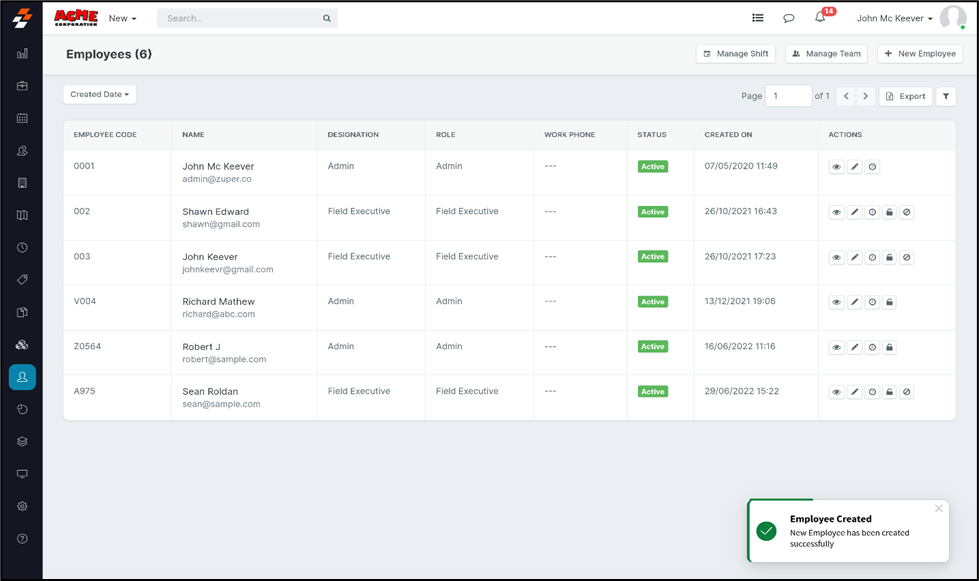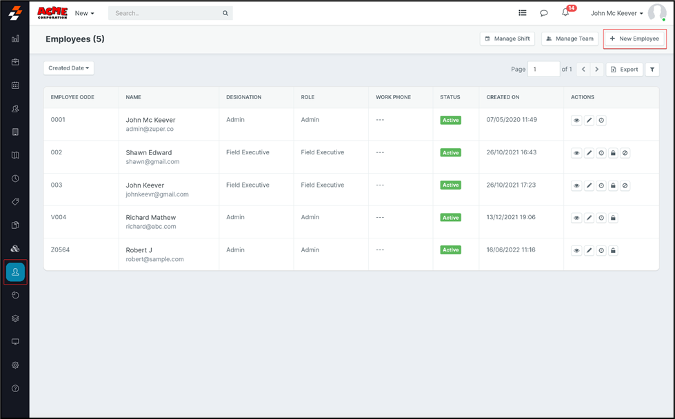 from the left panel and choose the “+New Employee” option.