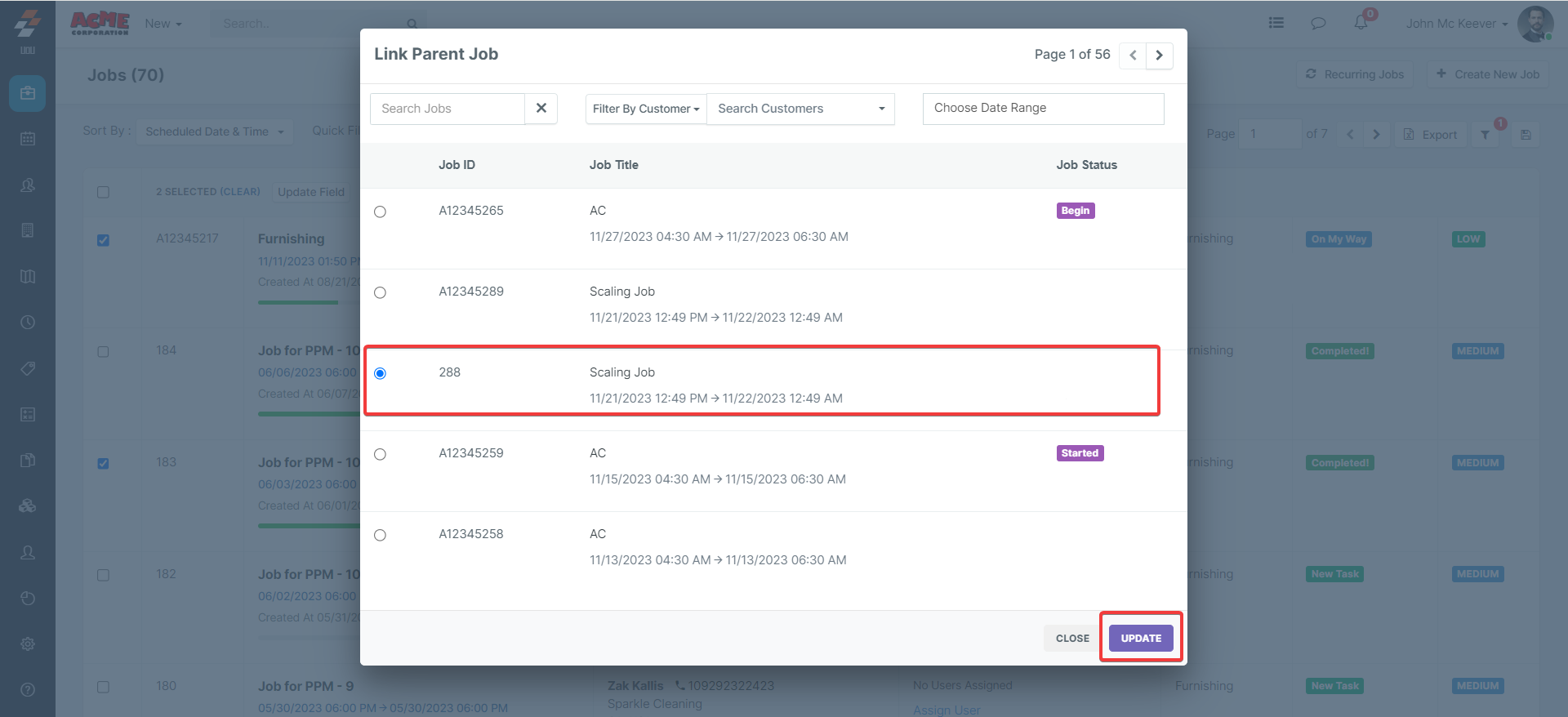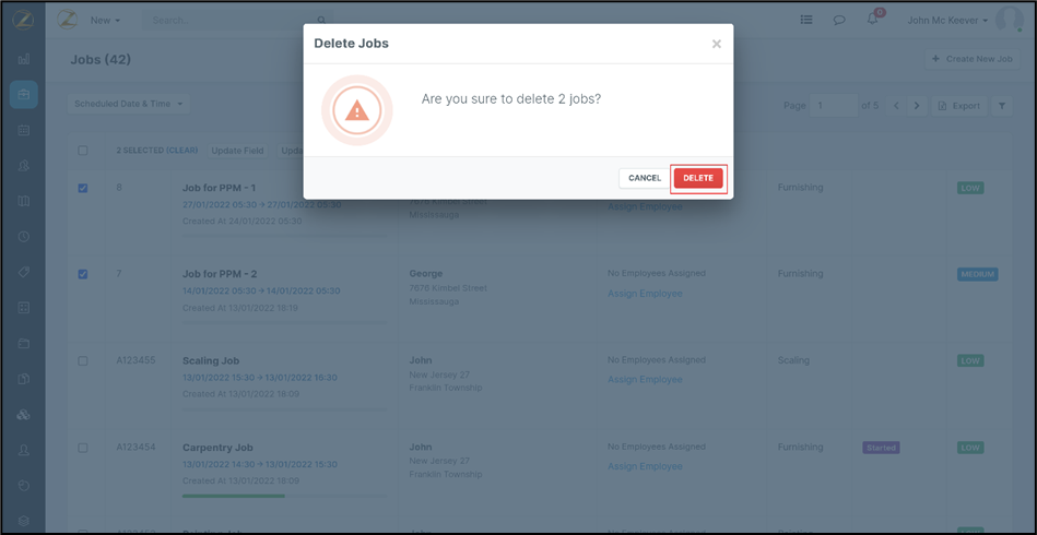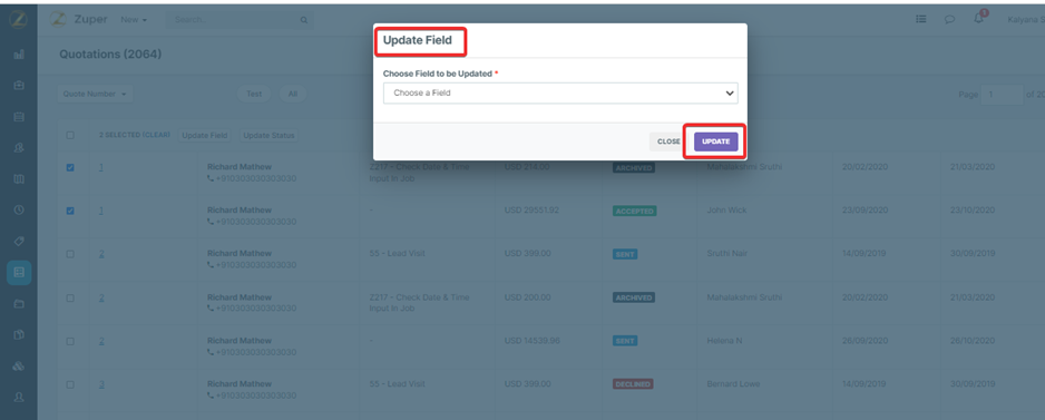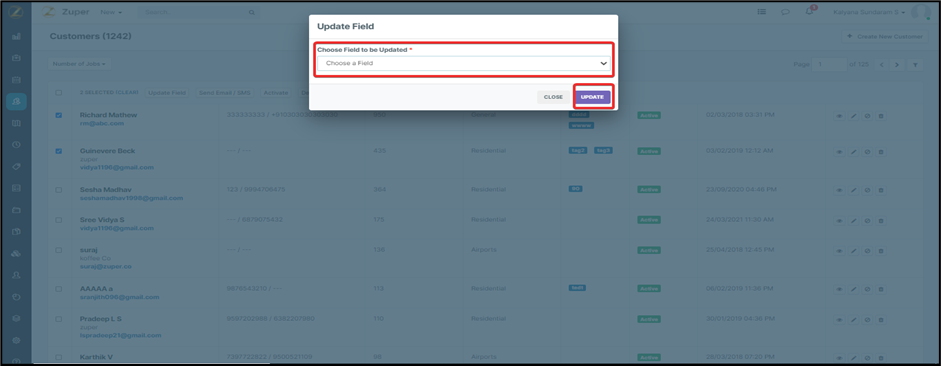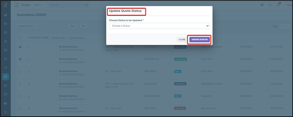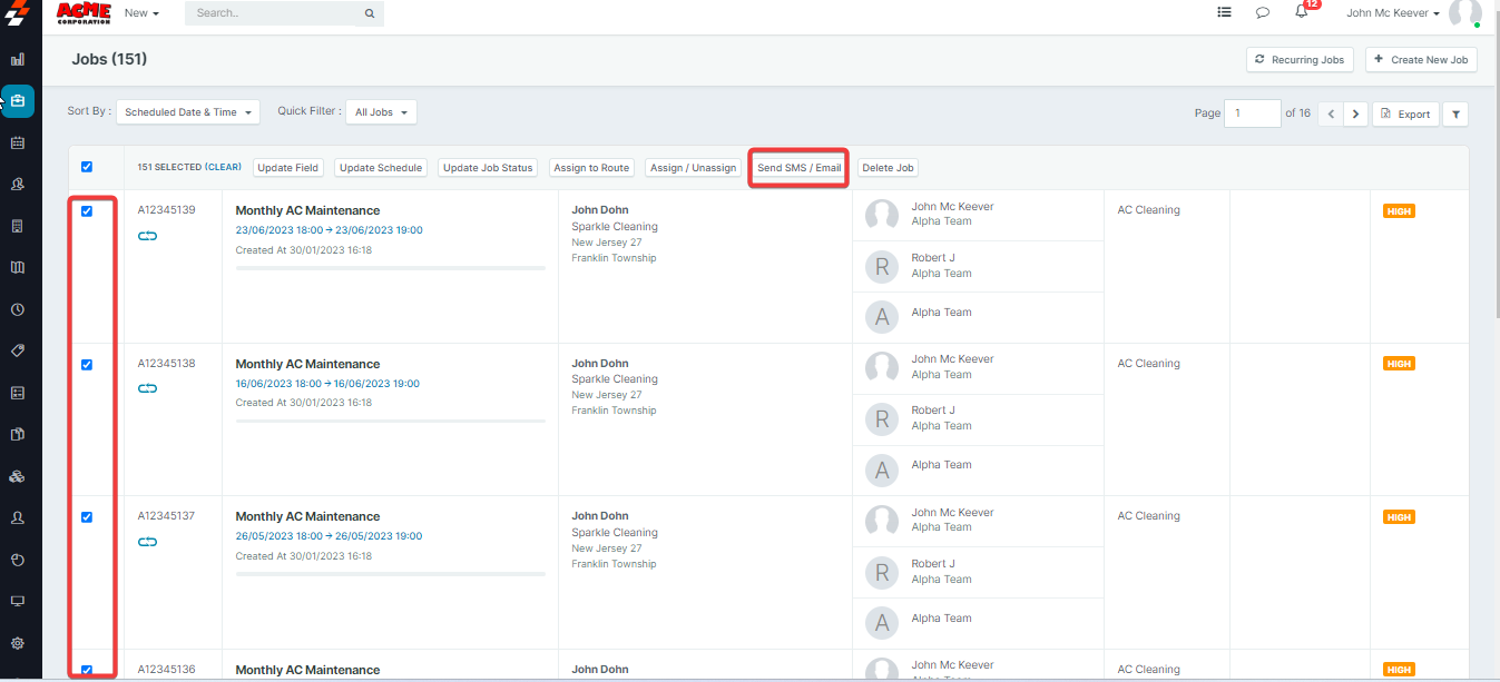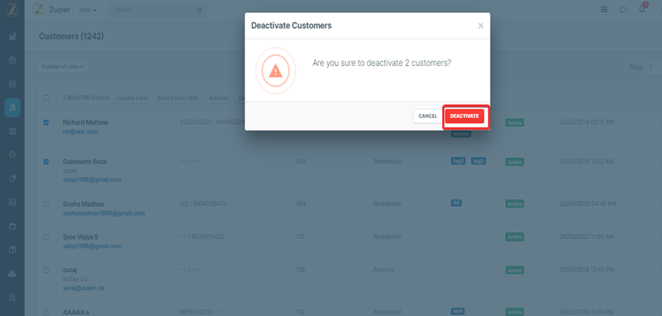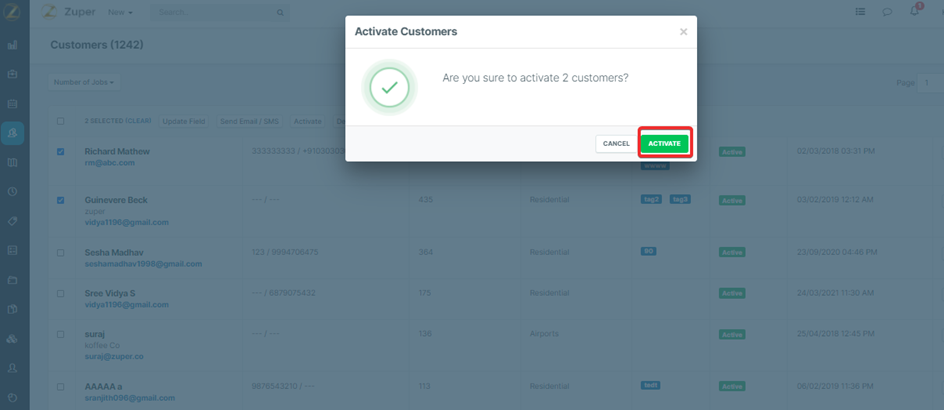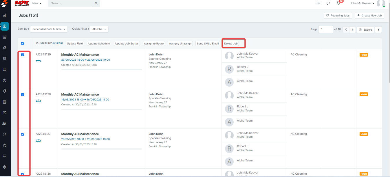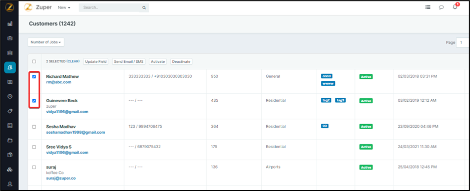 The bulk action on the Jobs, Customers, and Quotes modules helps you to