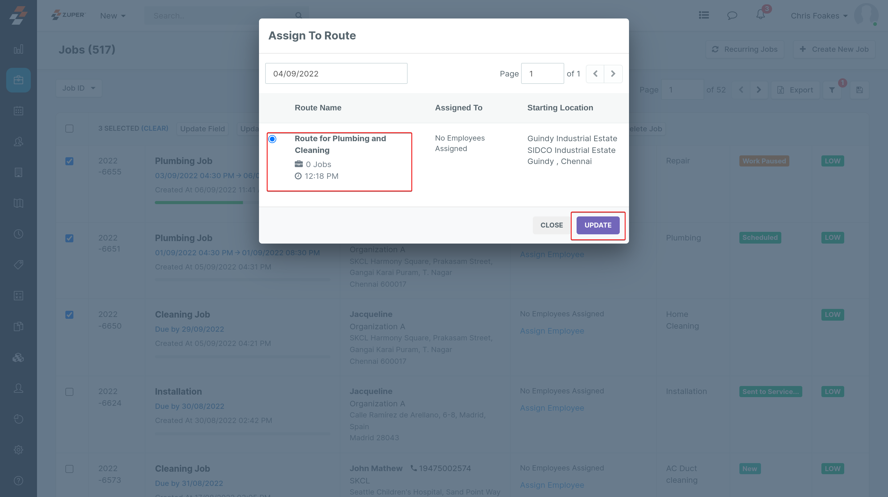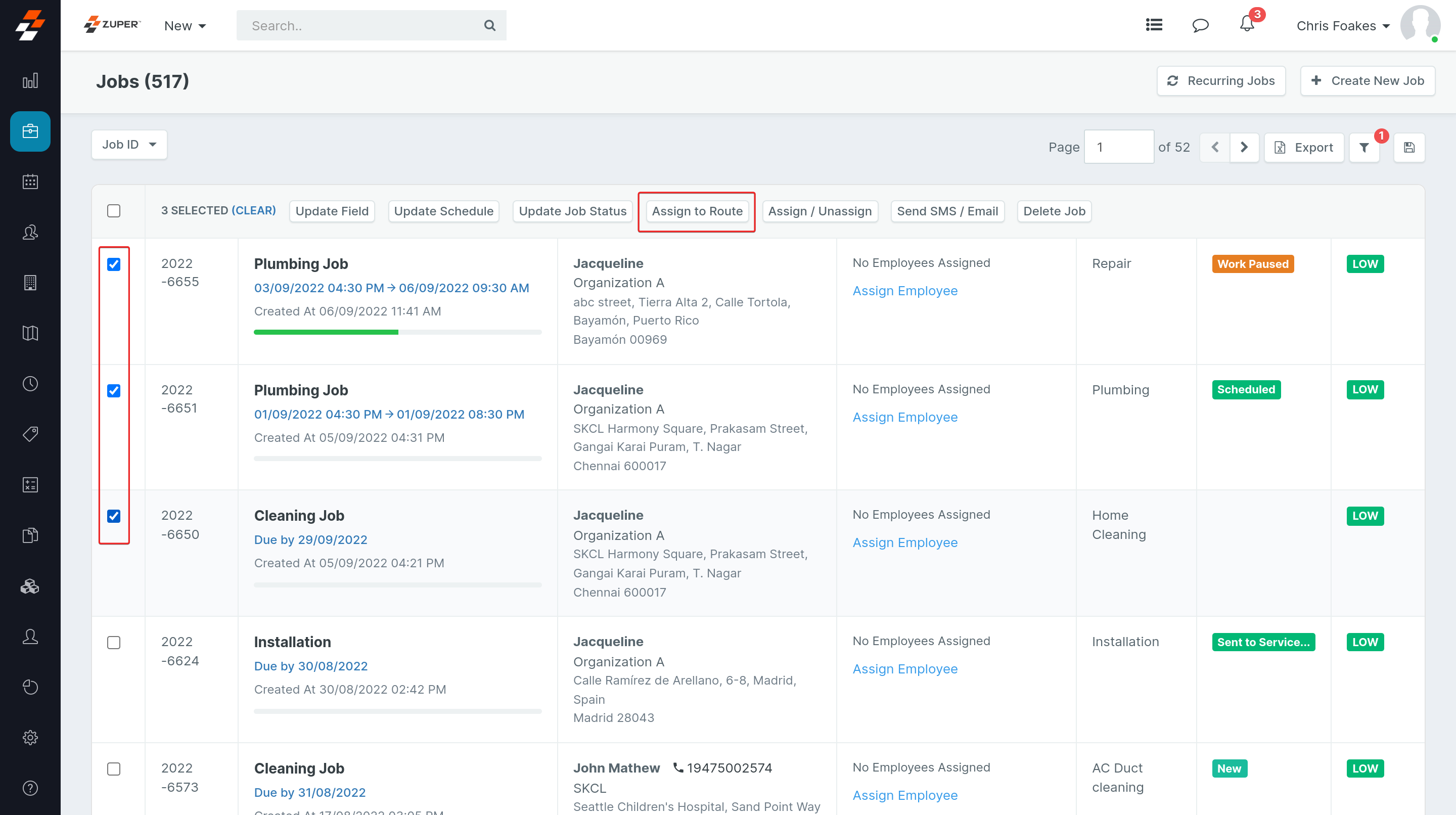 Navigation: Jobs --> Job --> Filter (Assign to Route as “No”) --> Bulk Select Action --> Assign RouteYou can bulk