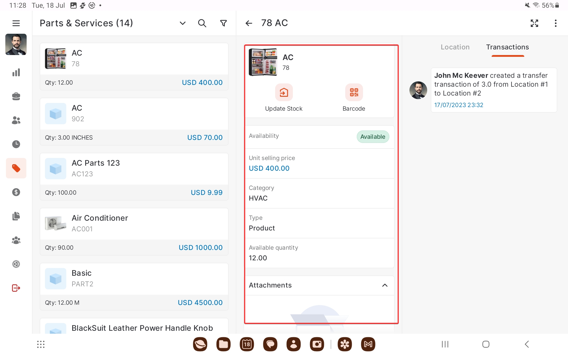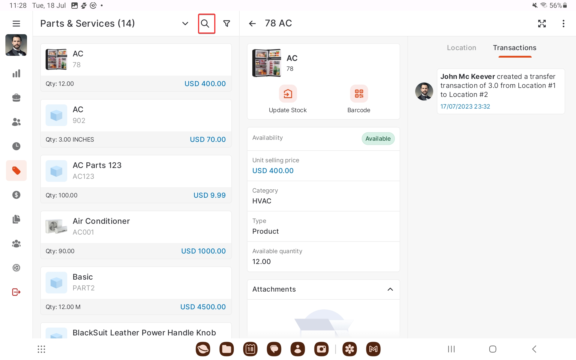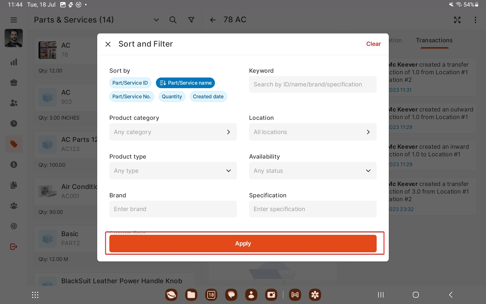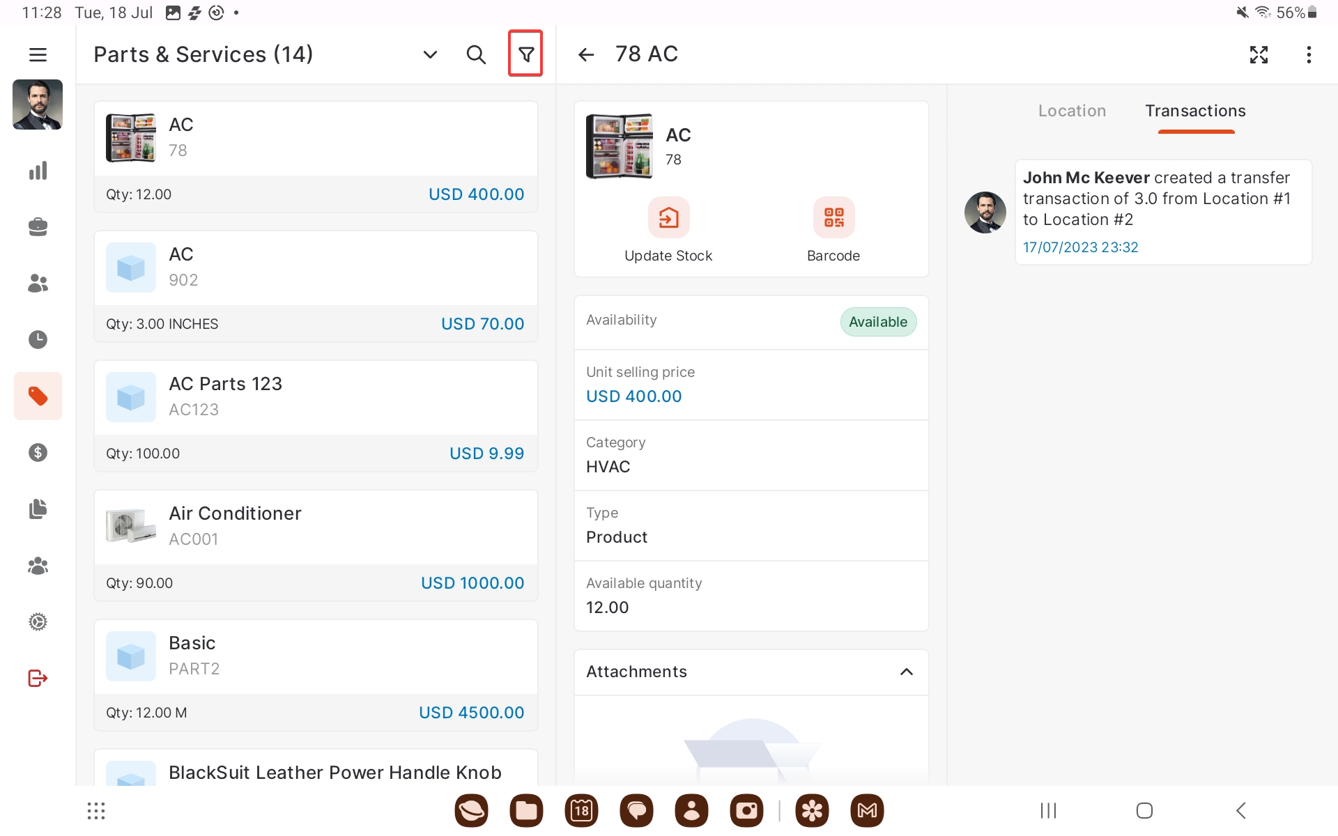 - Transaction: This displays the transaction history of the selected product/part/service.