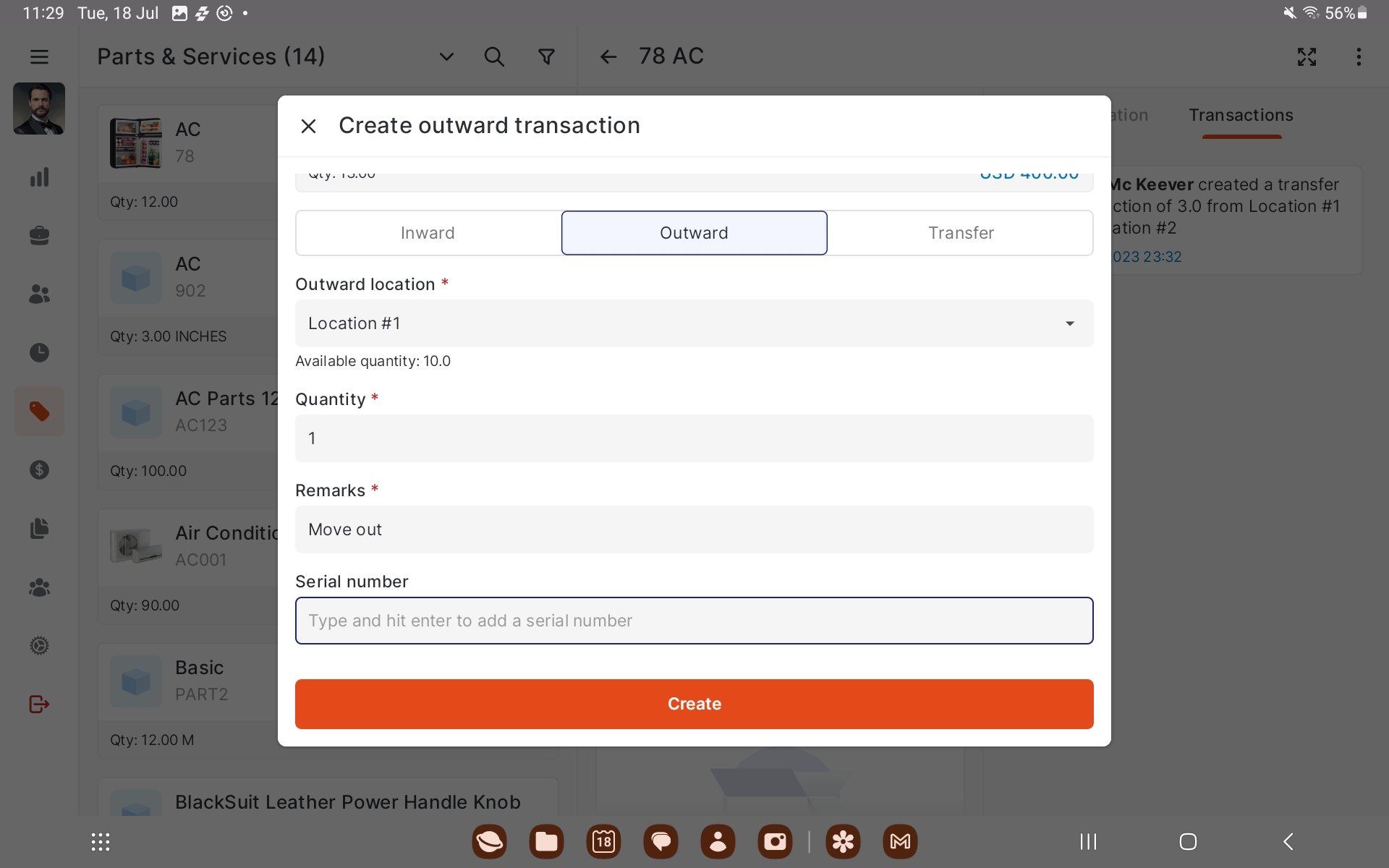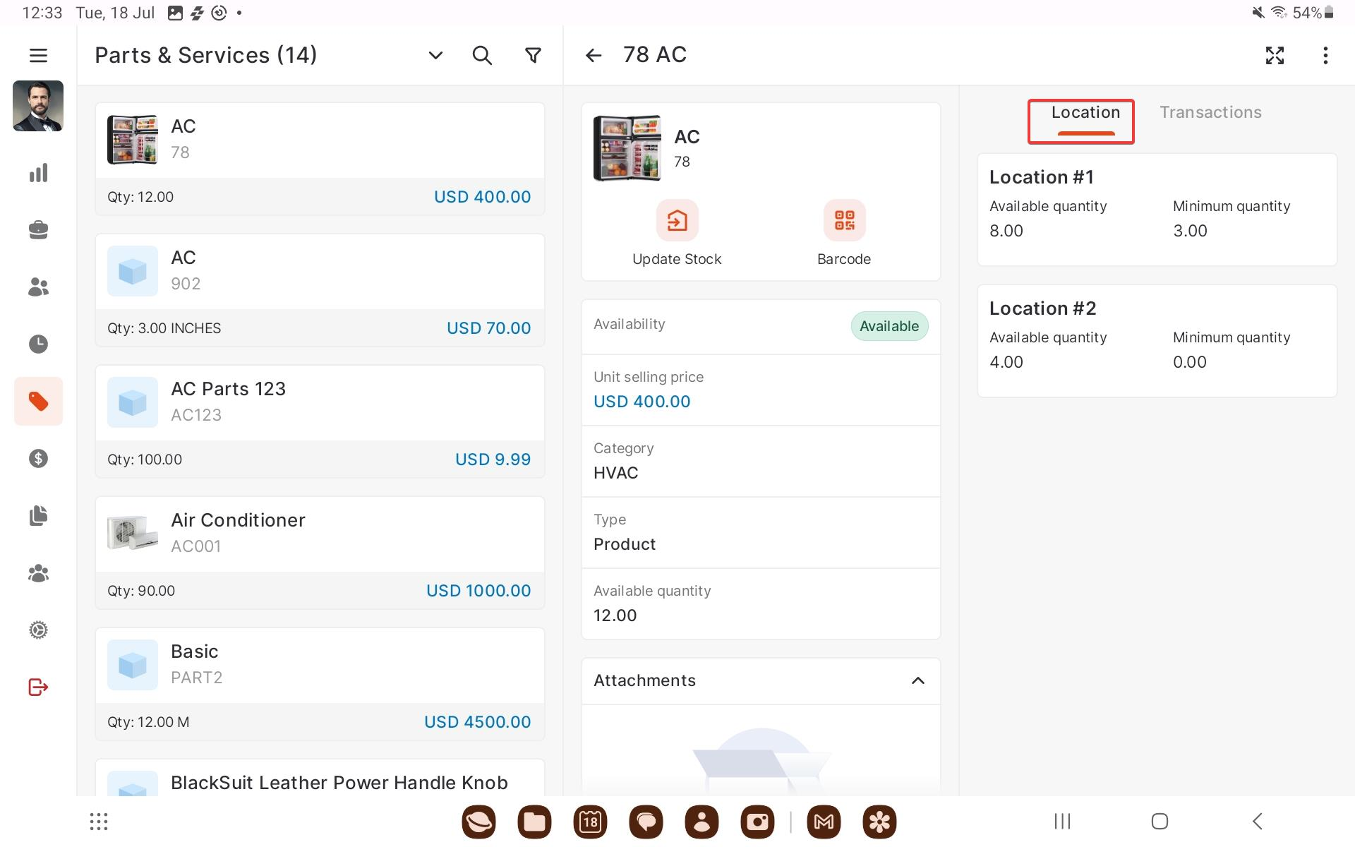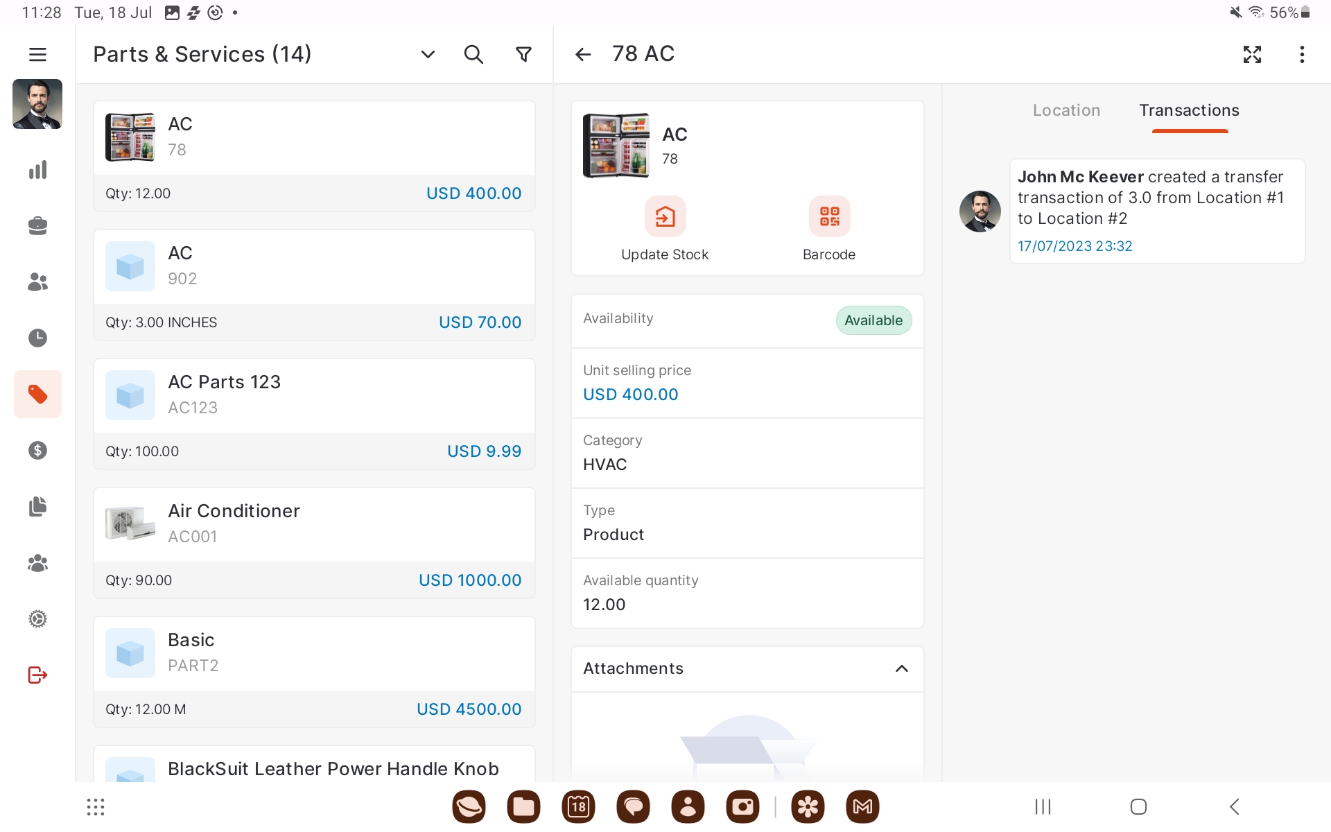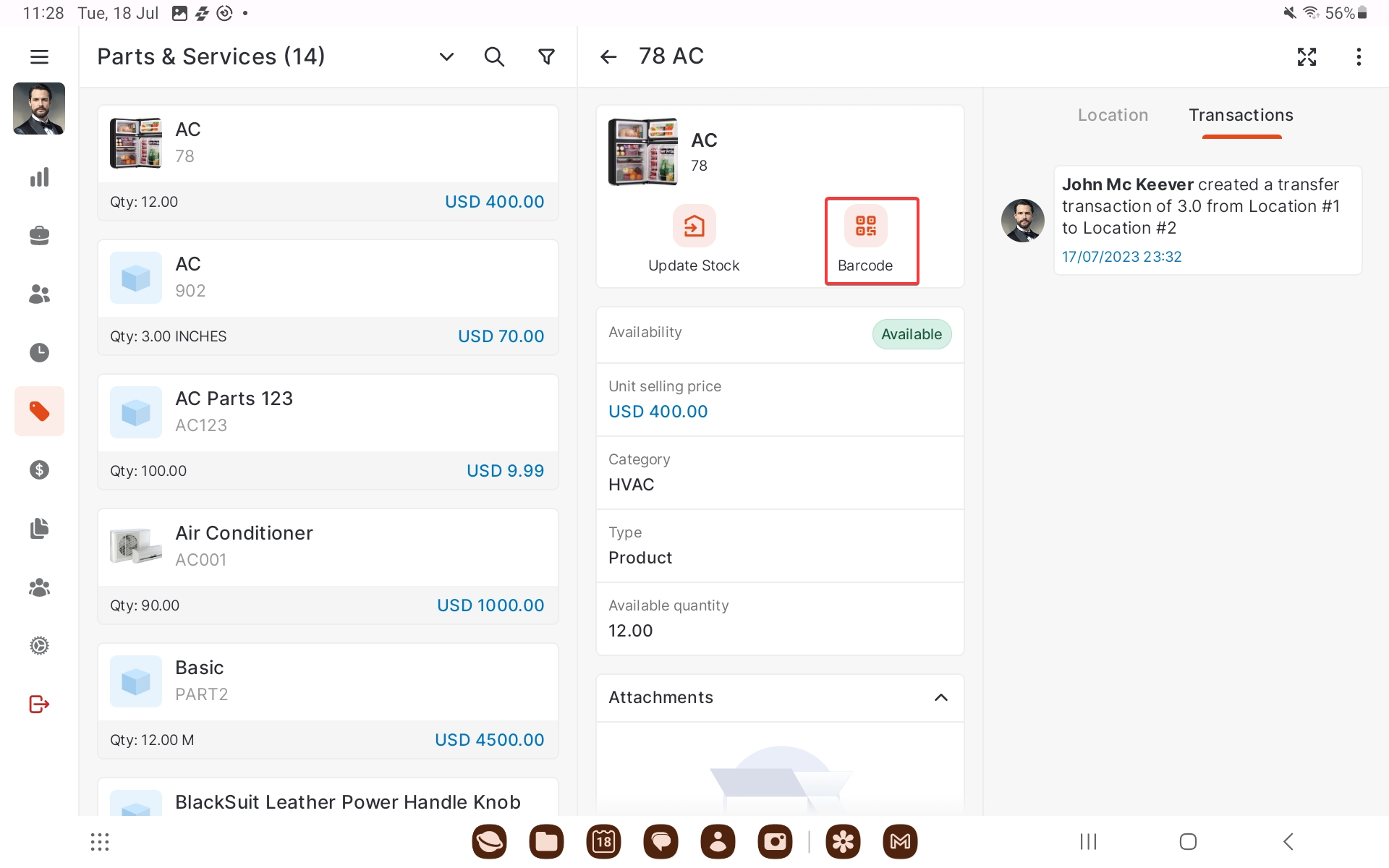 - Transaction: This displays the transaction history of the selected product/part/service.