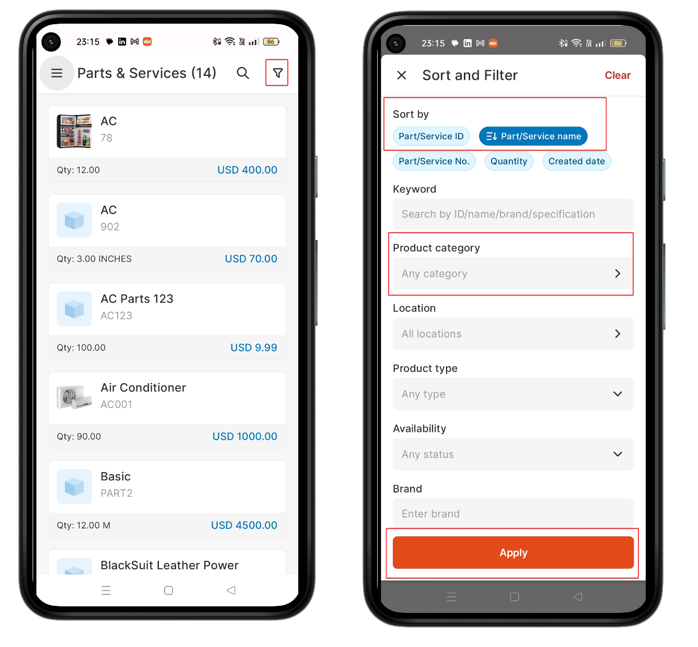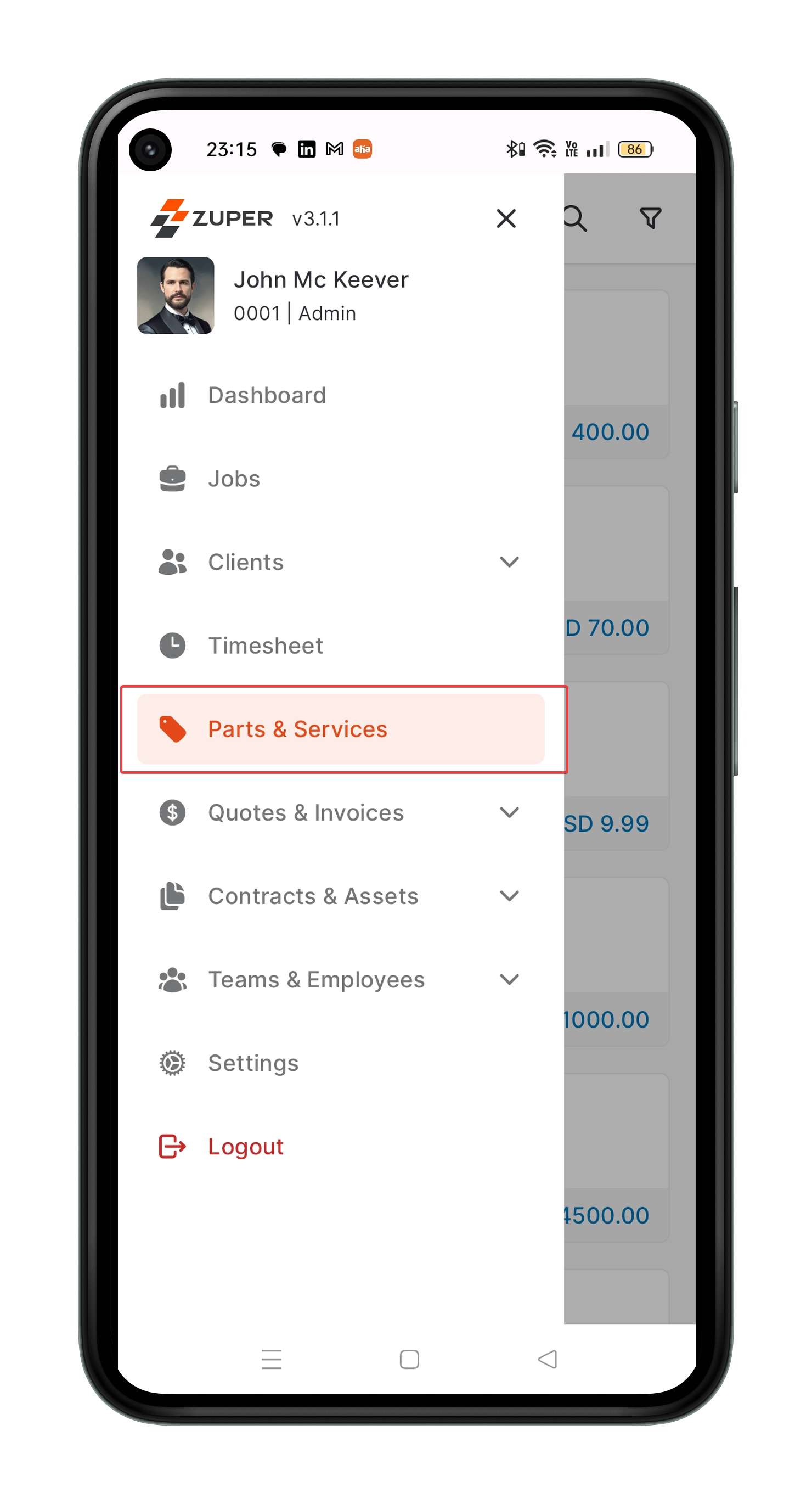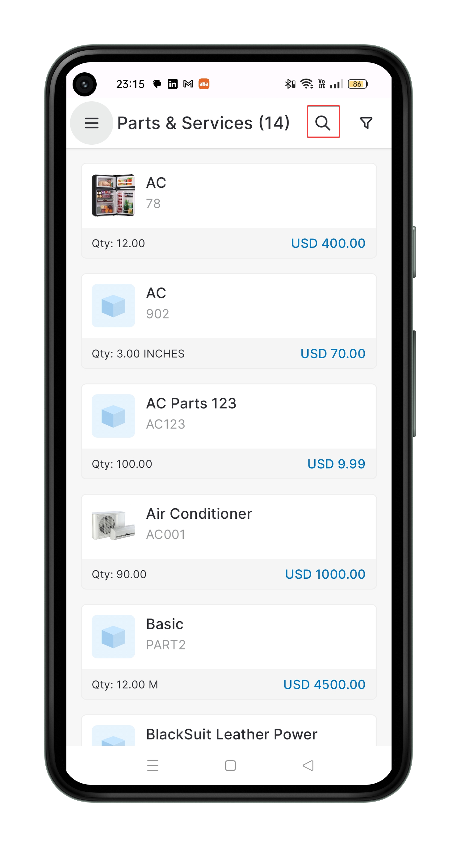 1. Select the "Parts & Services" module from the top-left hamburger icon. You can view the list of parts & services on the listing page.