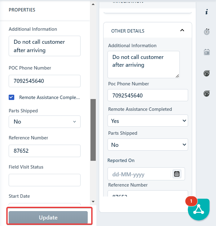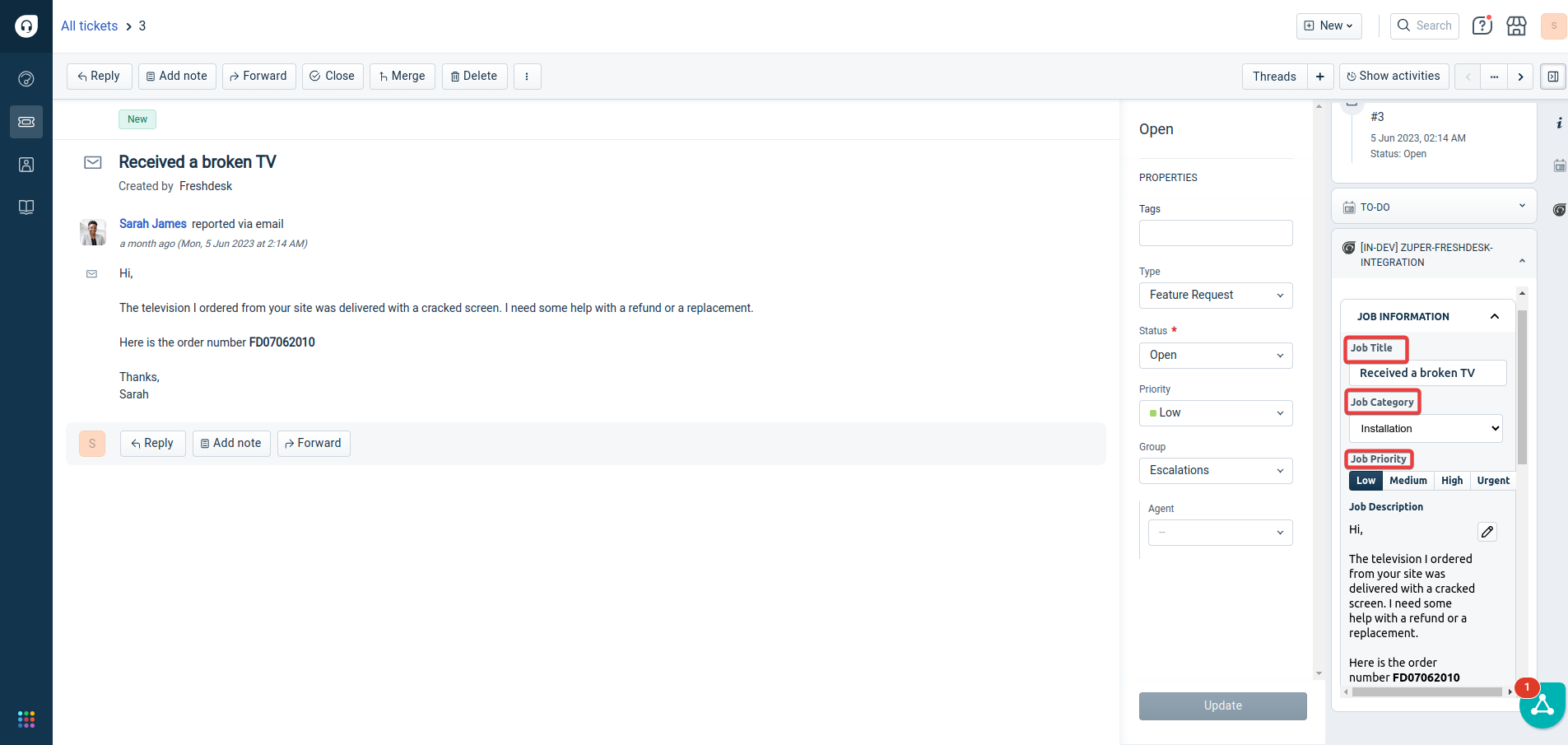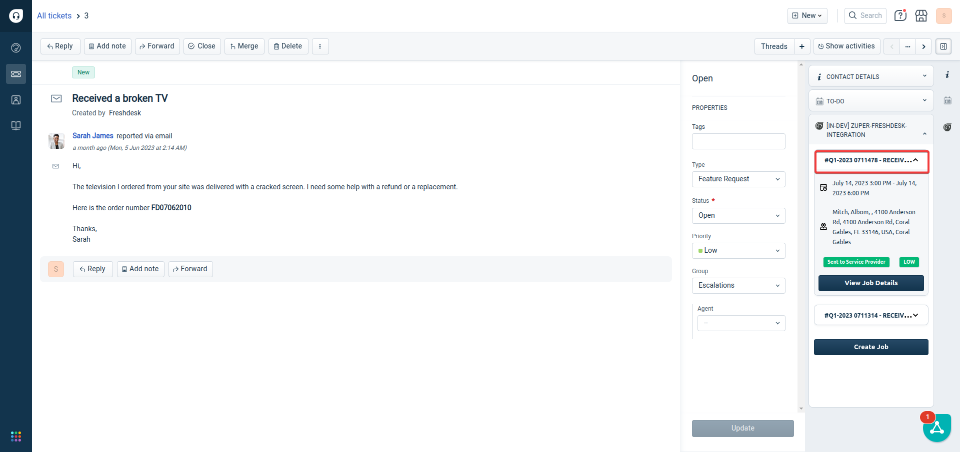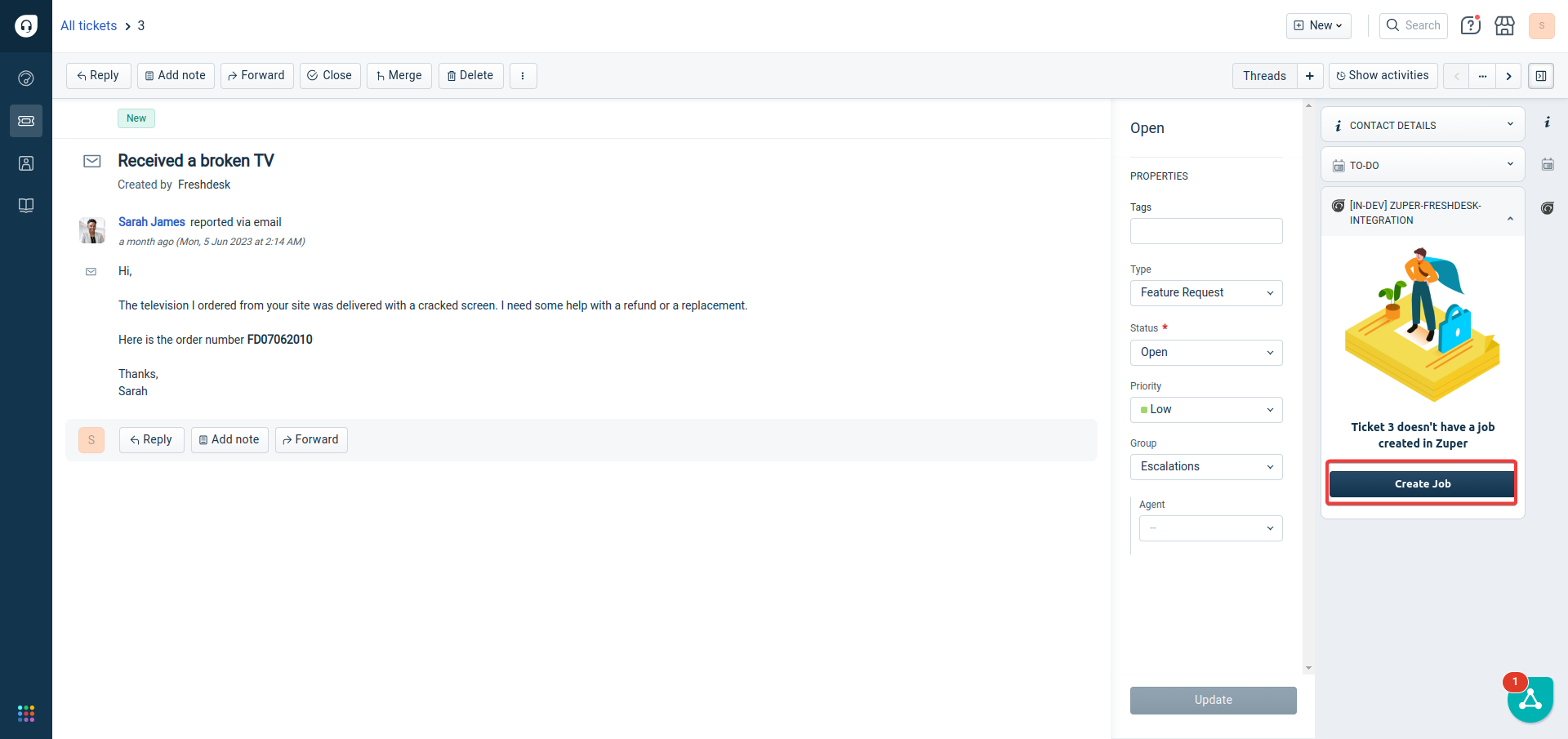 1. Log in to your Freshdesk account and in the right sidebar widget, you can view the ticket for which Job is not created in Zuper.