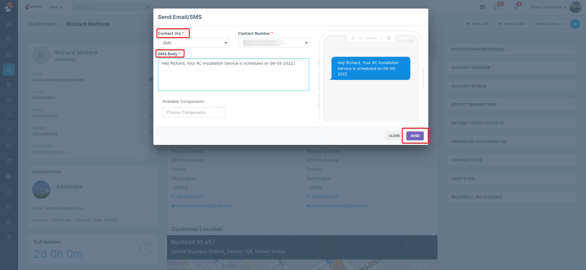 Select the “Send” button to send an SMS from Zuper via Invisble SMS.