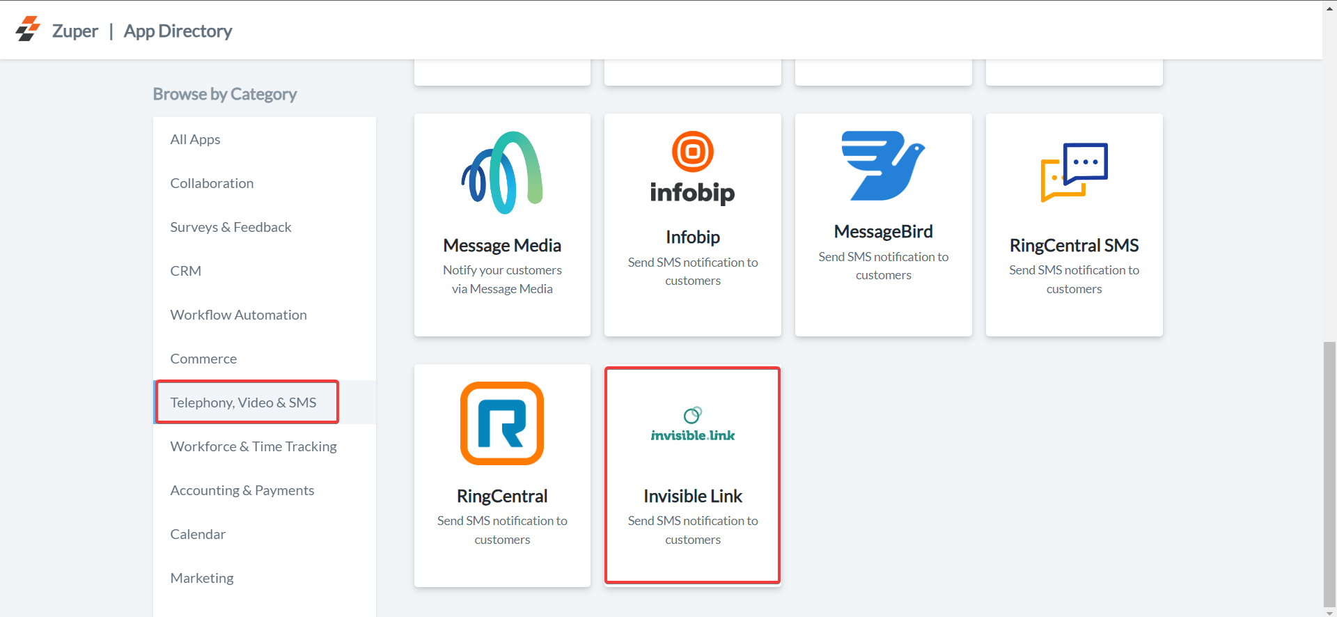 2. Under the “Browse by Category,” select the “Telephony, Video and SMS” option and choose “Invisible Link.”