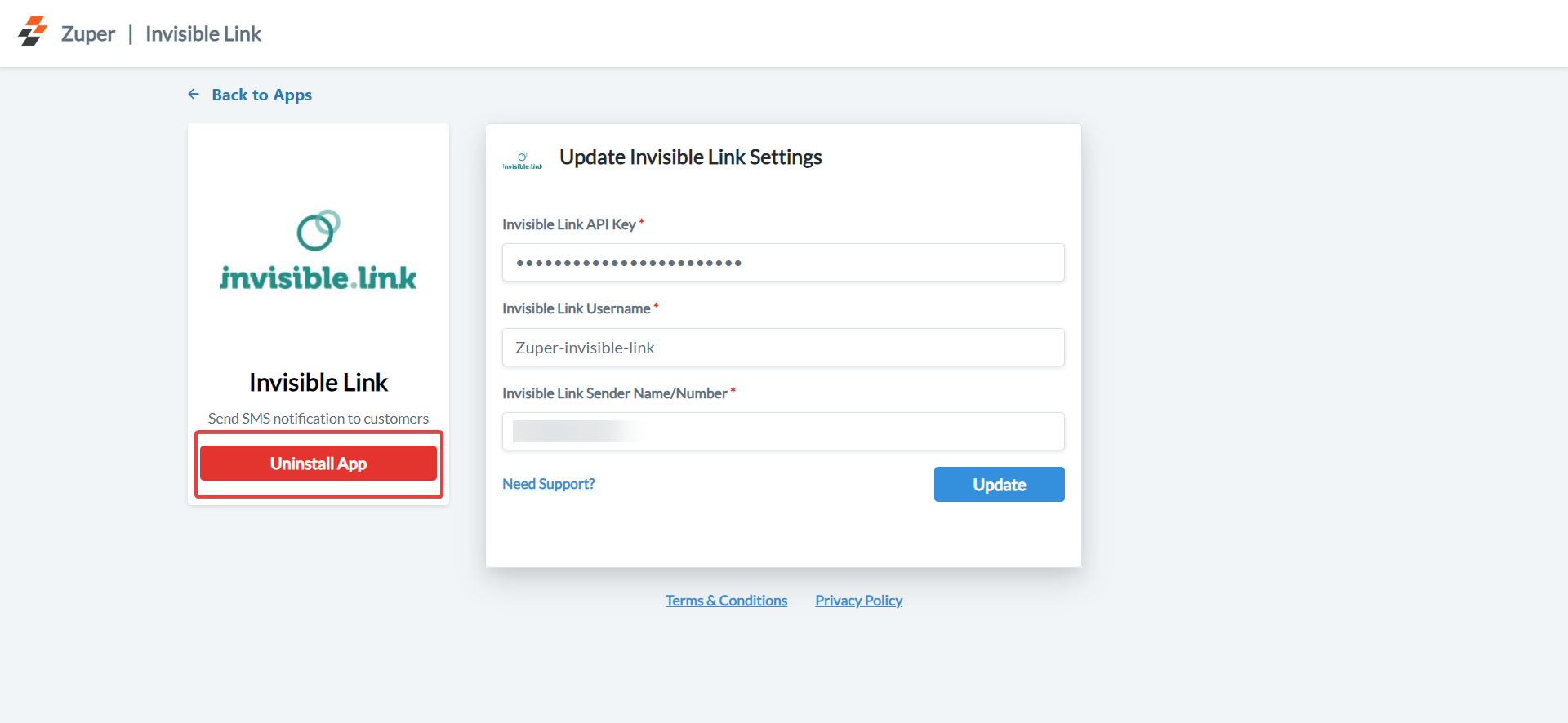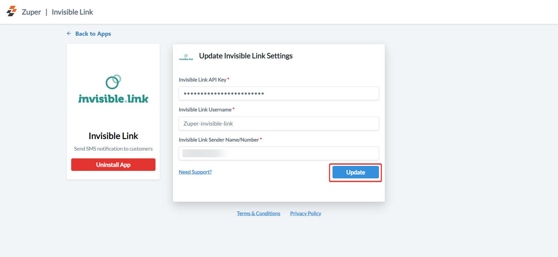 Select the “Update” button to complete the integration of Zuper with Invisible SMS.
