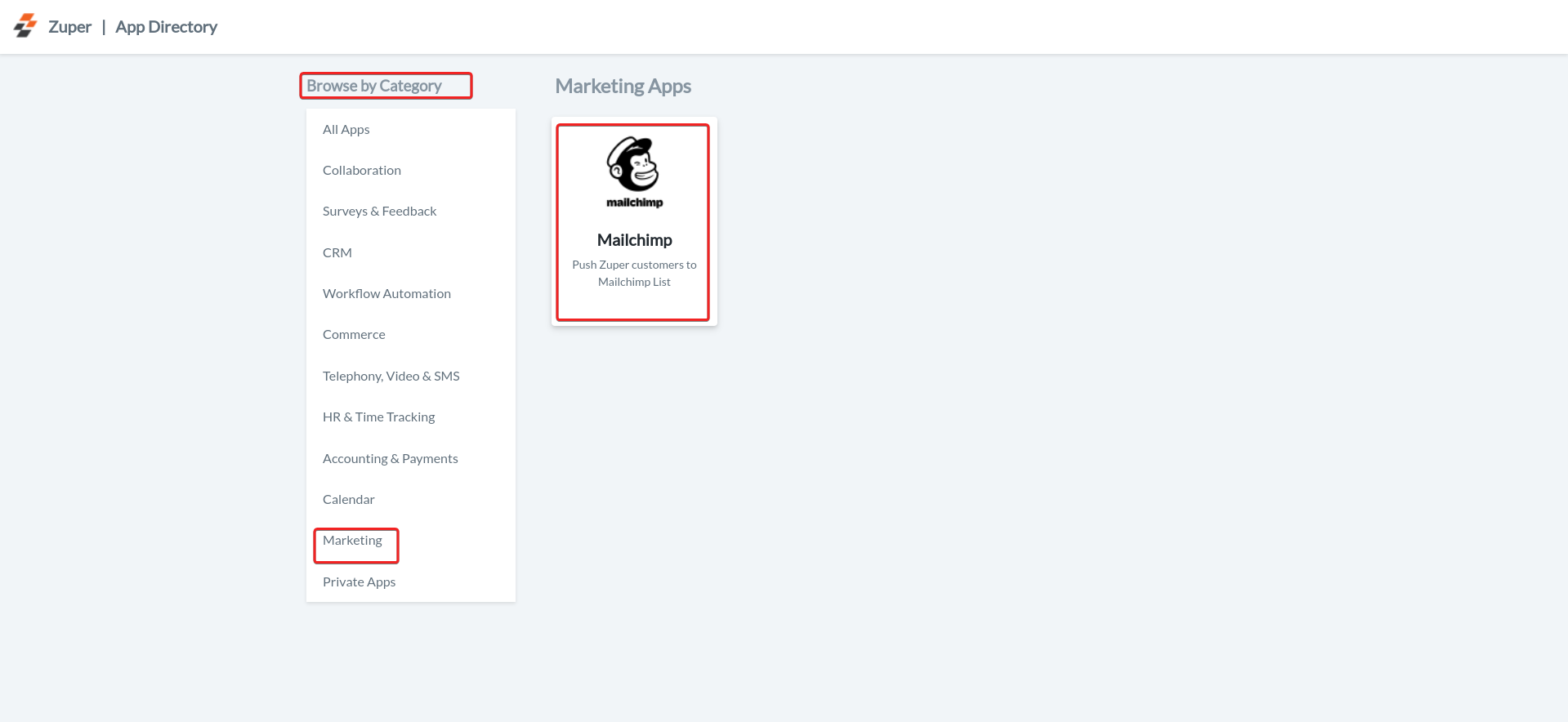 2. Under the “Browse by Category,” select the “Marketing” option and choose “Mailchimp.”