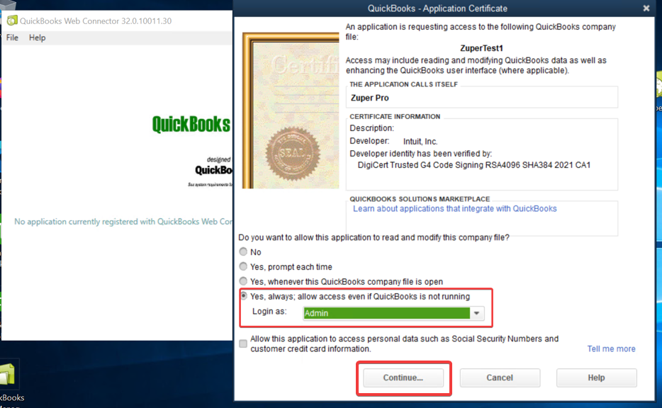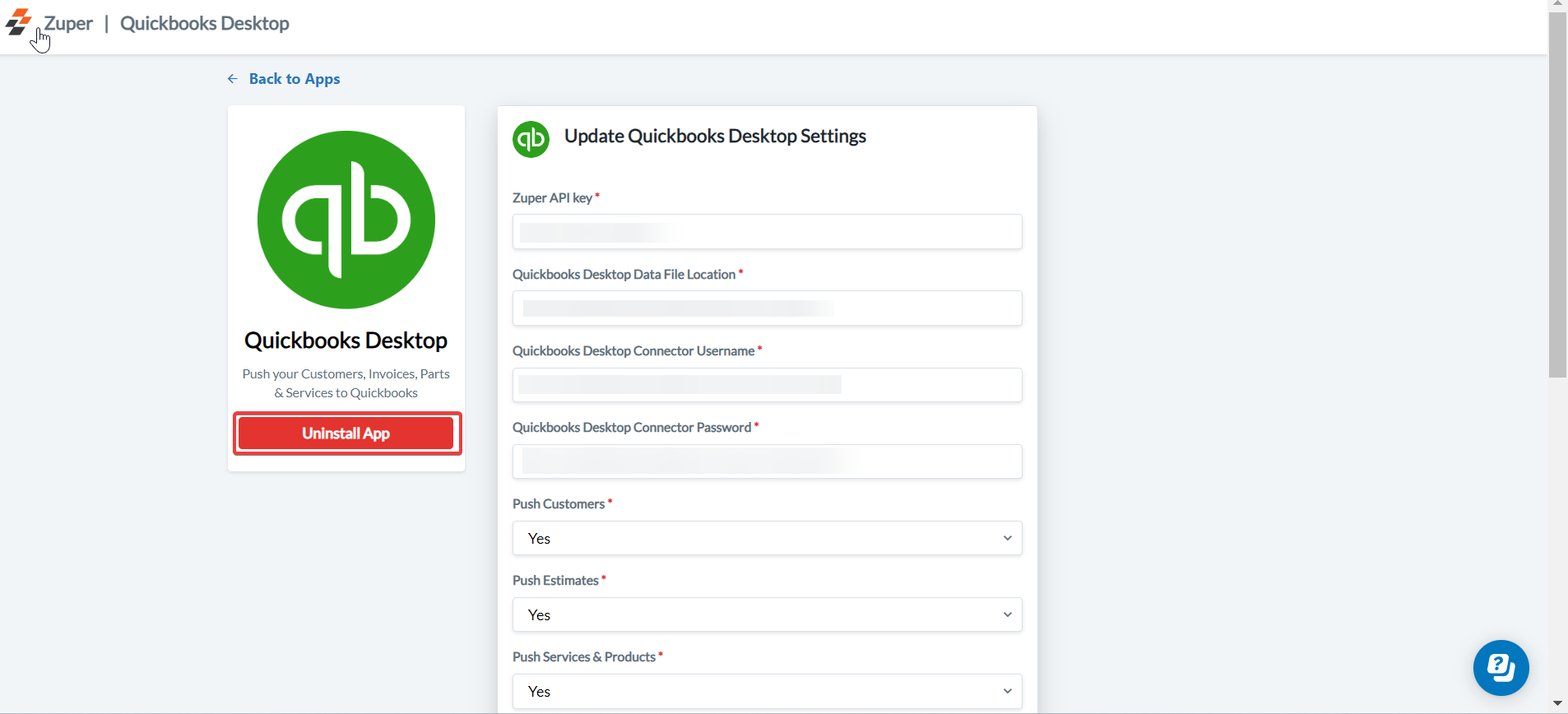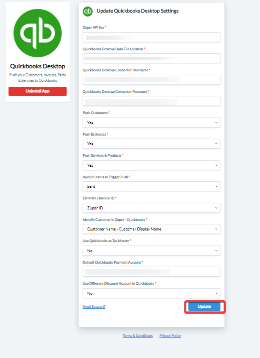 “Update” button to connect QuickBooks Desktop with Zuper.
