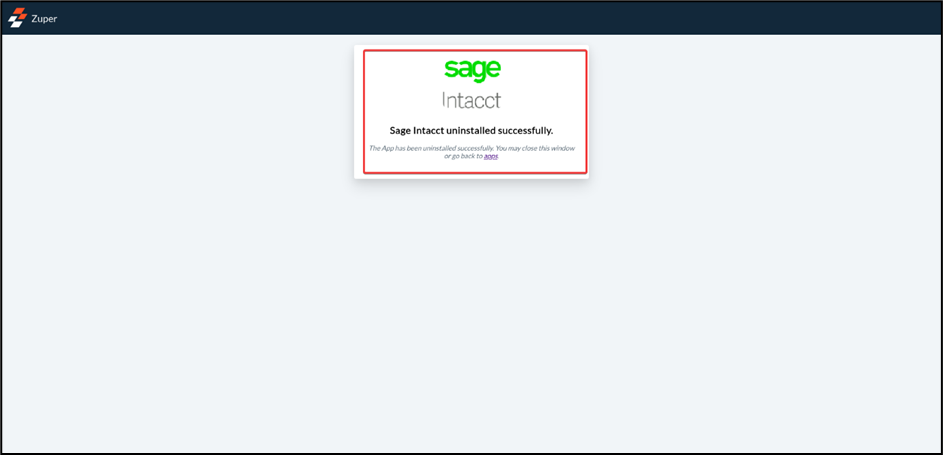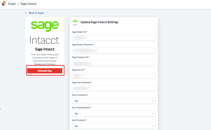 Select the “Update” button to connect Sage Intacct app with Zuper.