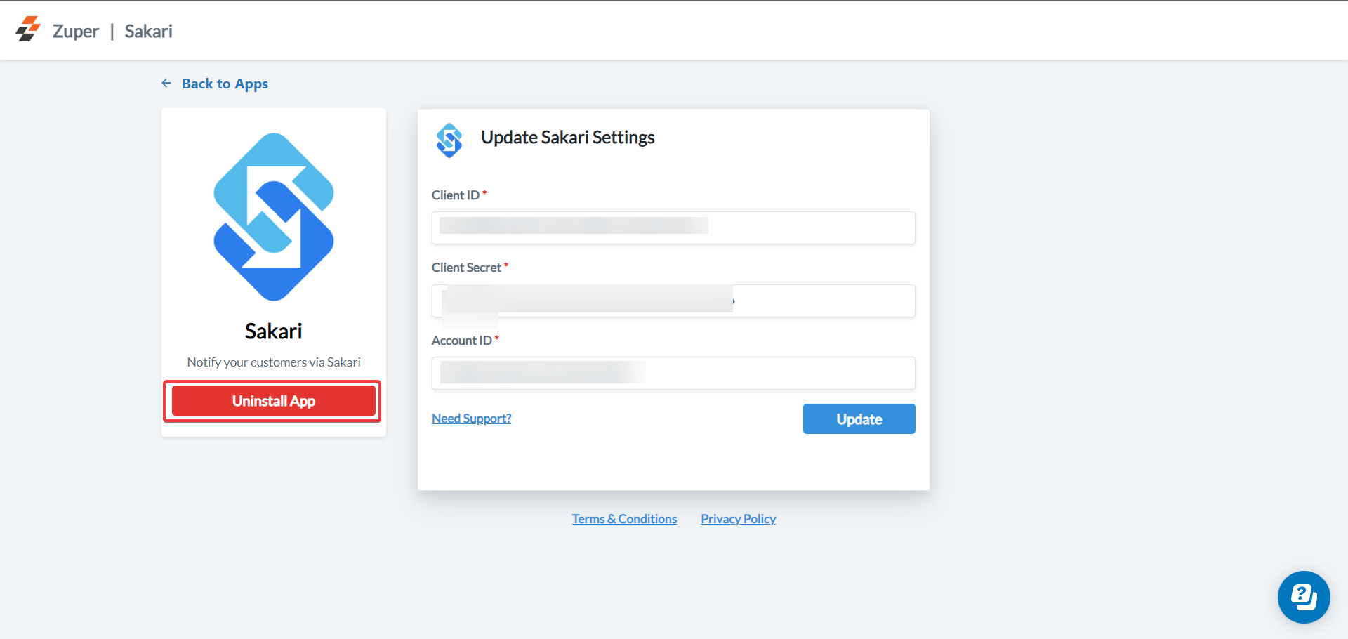 Select the “Update” button to complete the integration of Zuper with Sakari.
