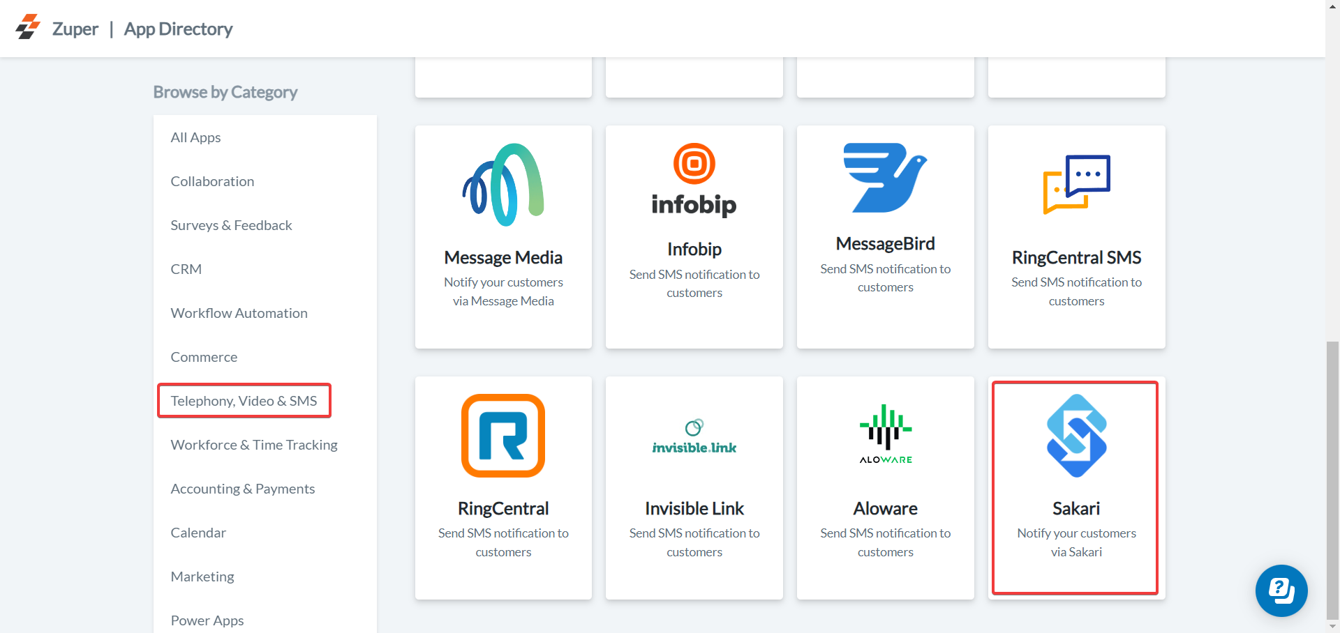 2. Under the “Browse by Category,” select the “Telephony, Video and SMS” option and choose “Sakari.”