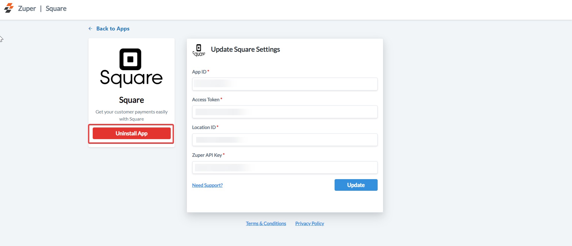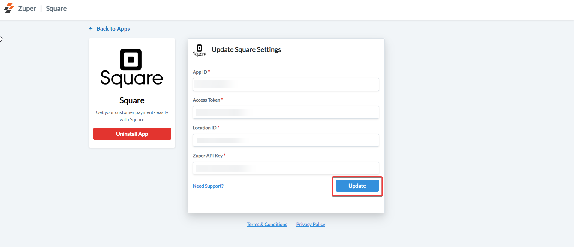 e. Select the “Update” button to connect Square app with Zuper.