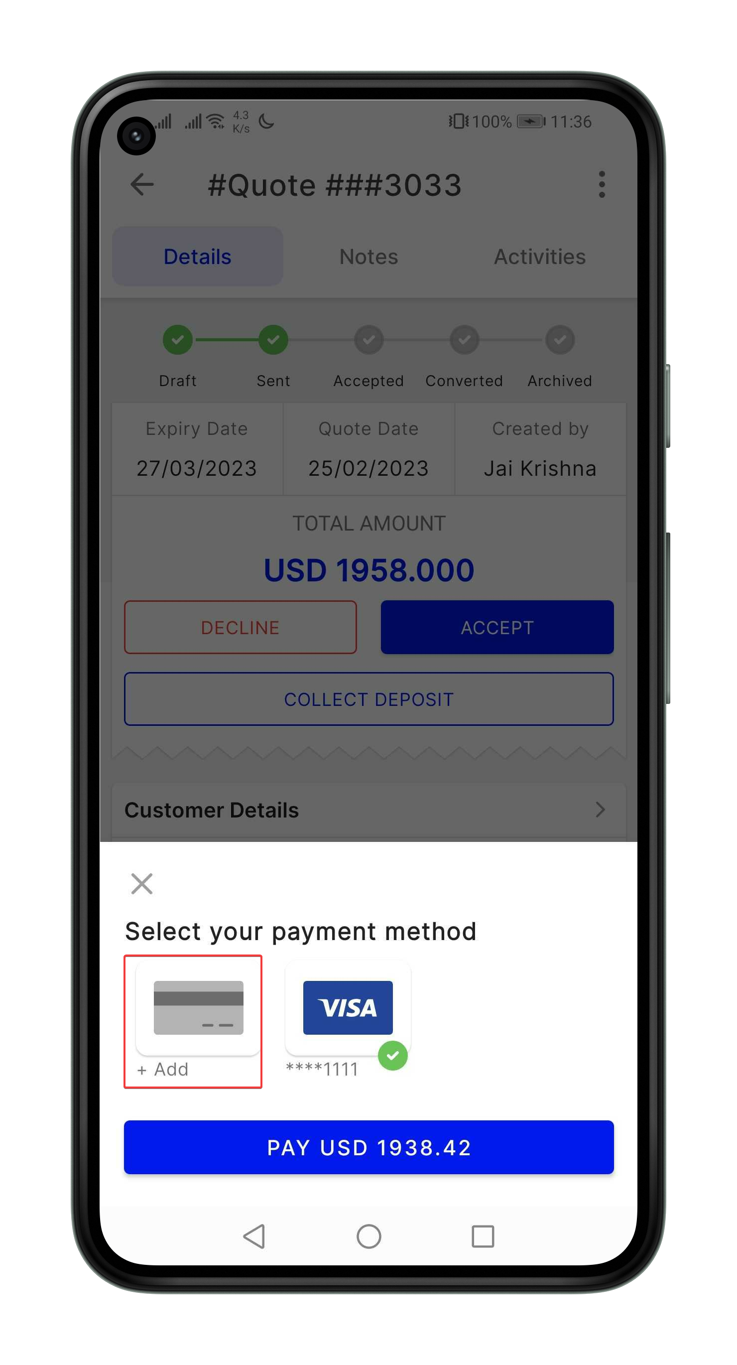 Navigation: Accounting --> Quotations --> Collect Deposit | Accounting --> Invoices --> Payment