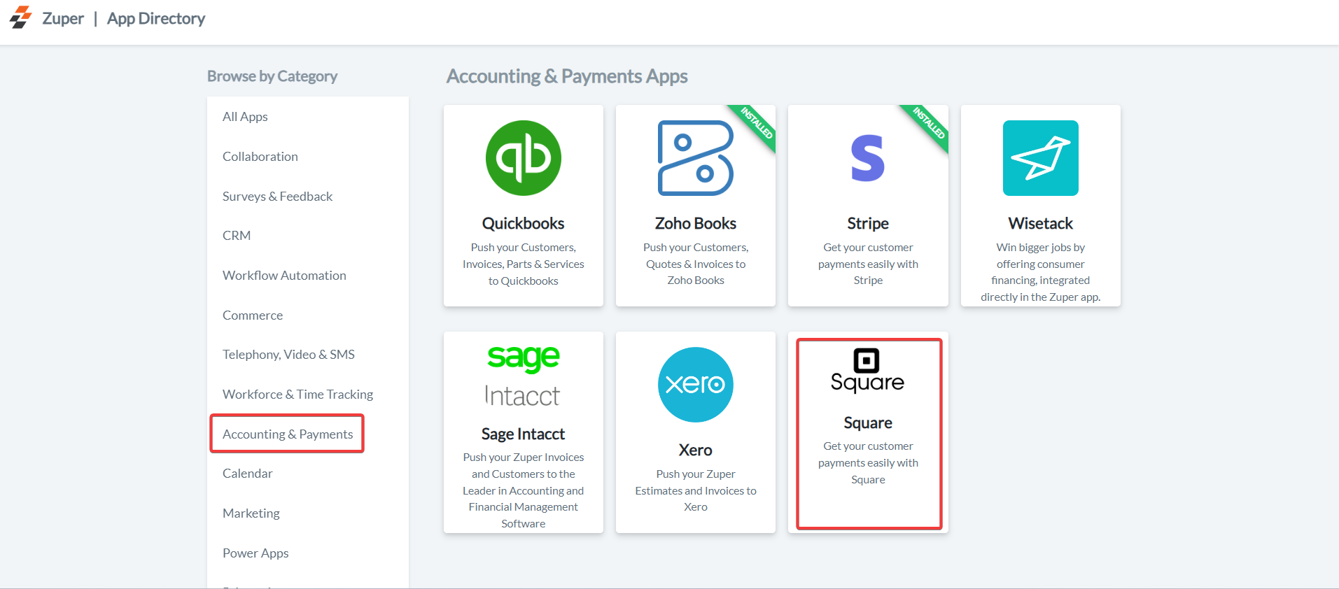 3. Under the “Browse by Category,” select the “Accounting and Payments” option and choose “Square.”