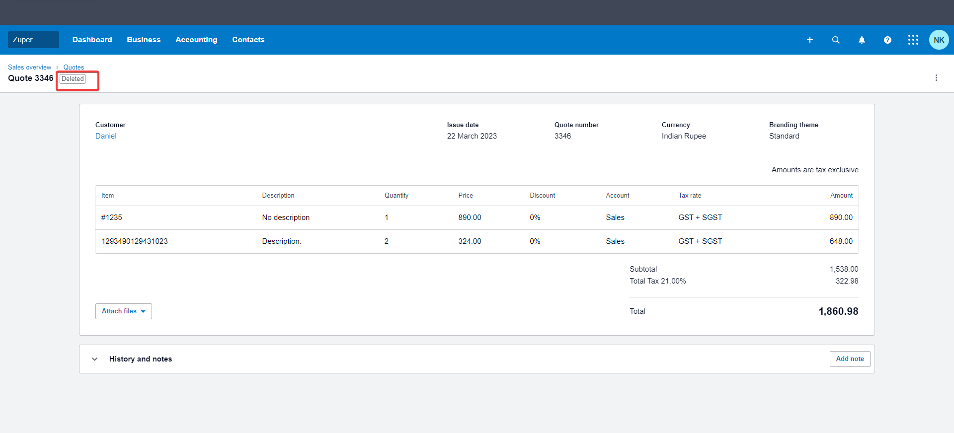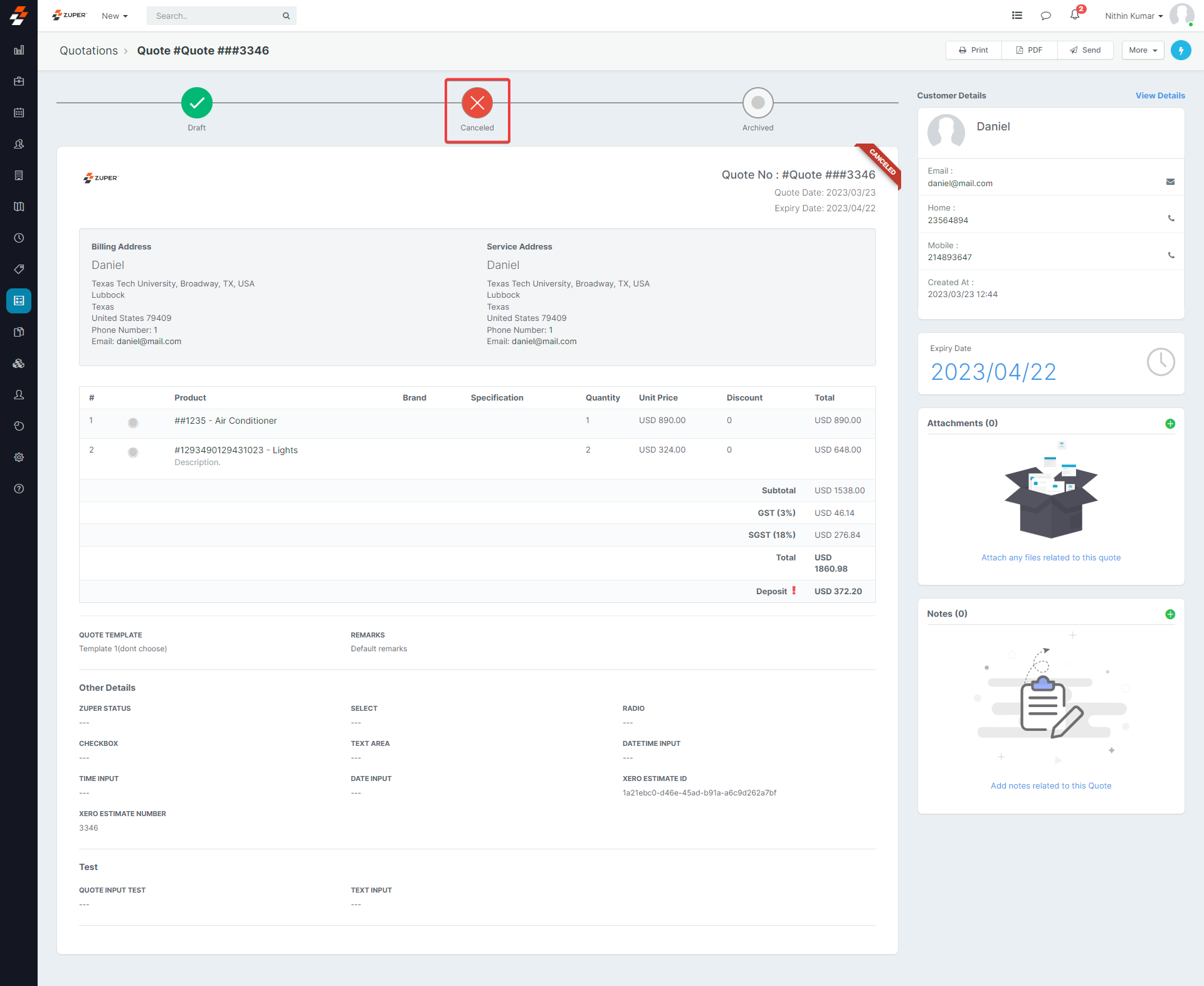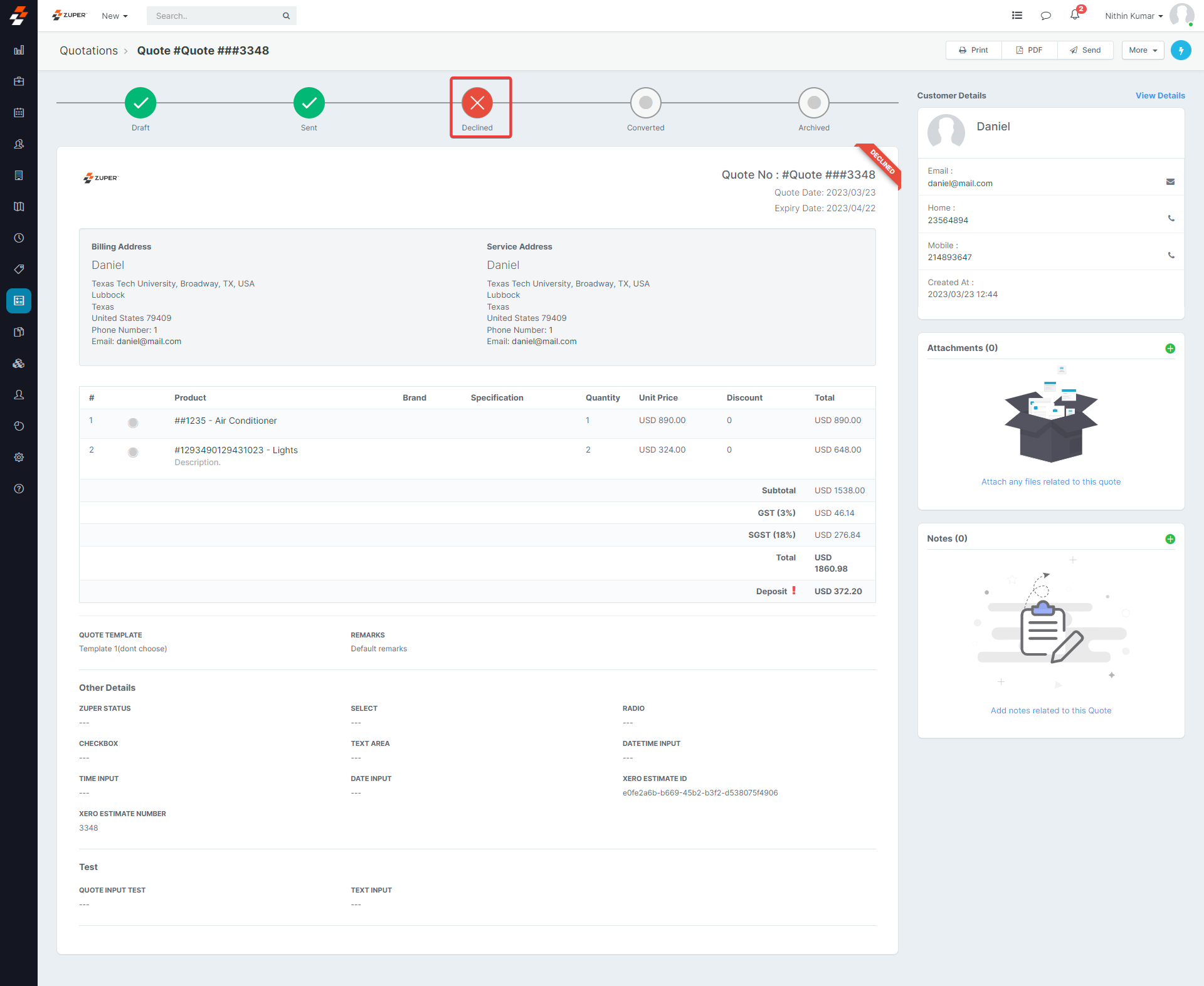 Once a quote is deleted in Zuper, it will be reflected in Xero based on the integration settings as “Deleted” in Xero.